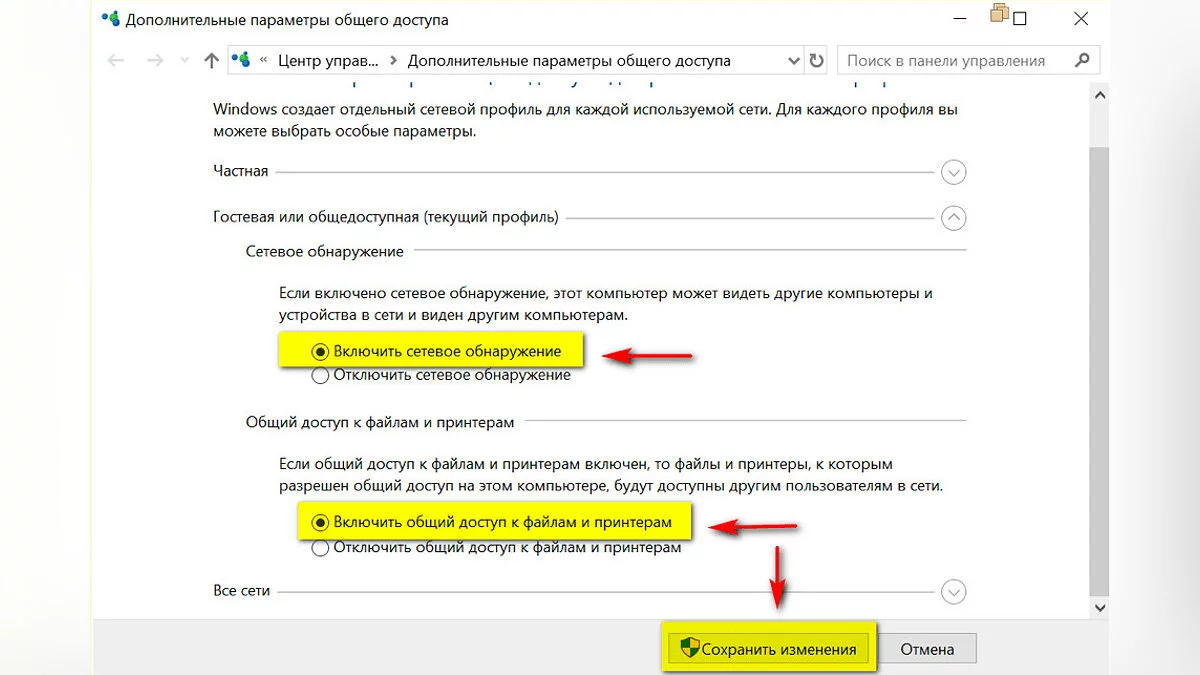 Далее настраиваем параметры сетевого обнаружения (нужно включить сетевое обнаружение и доступ к принтерам и файлам, перейдя в раздел «Панель управления», «Центр управления сетями и общим доступом», «Изменить дополнительные параметры общего доступа»).