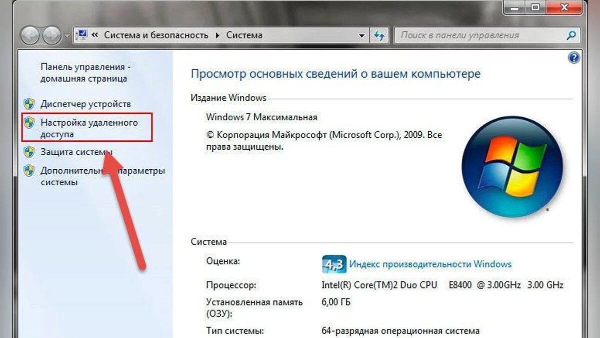 - Зайти в «Панель управления», раздел «Система» и далее «Настройка удаленного доступа»;
