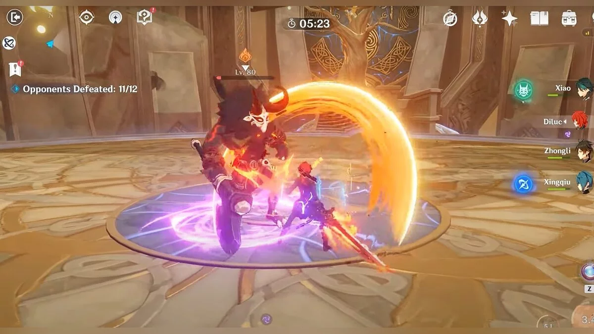 В этой серии испытаний стоит полагаться на Гео-персонажа. При сочетании его атак с другими стихиями (льда, электричества, огня или воды) на поле боя будут появляться кристаллы. Если вы их подберёте, то у ваших героев появится щит, эффективный против вражеских атак соответствующей стихии. В Зале текущего песка пользоваться ими стоит не только по необходимости, но и для нанесения дополнительного урона. Оптимальный состав команды: