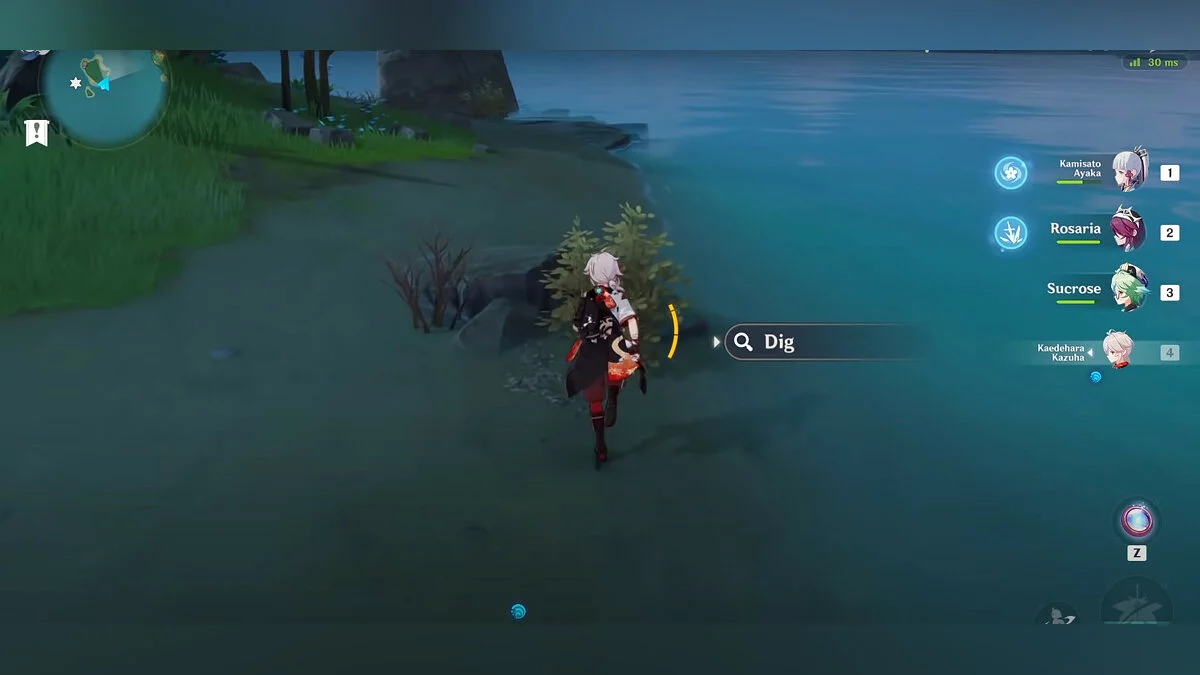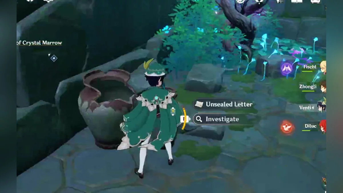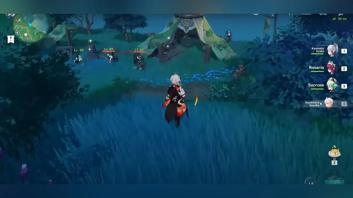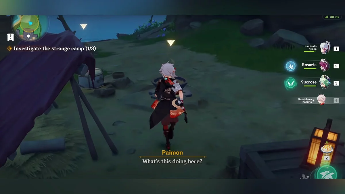 На окраине города стоит неприметный дом. Зайдя за него, вы обнаружите тайный люк, ведущий в совершенно другую локацию. Вы окажетесь в лагере, где запустится мини-квест. Взаимодействуйте с тремя предметами, после чего смотрите кат-сцену. В награду вы получите 20 000 моры и немного ресурсов.