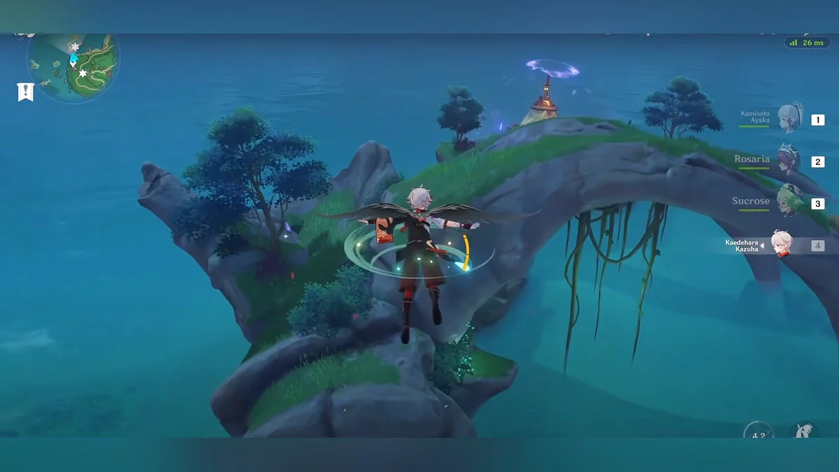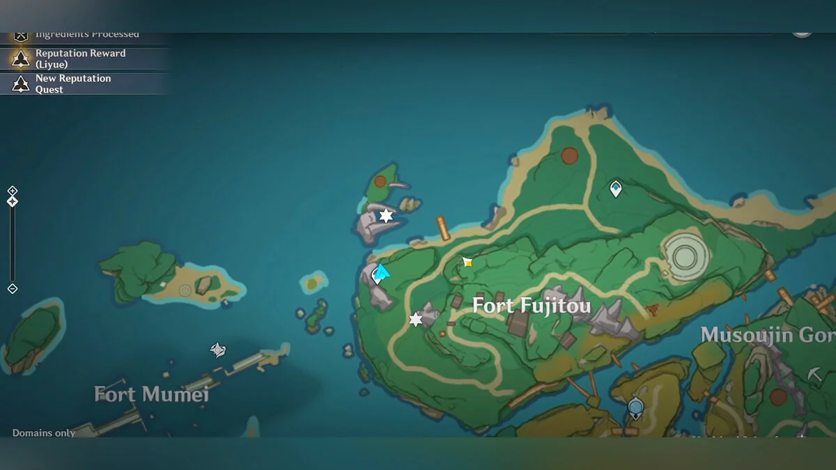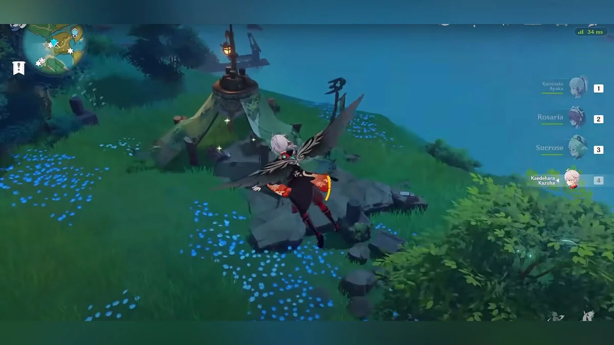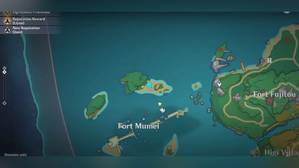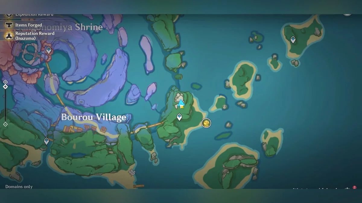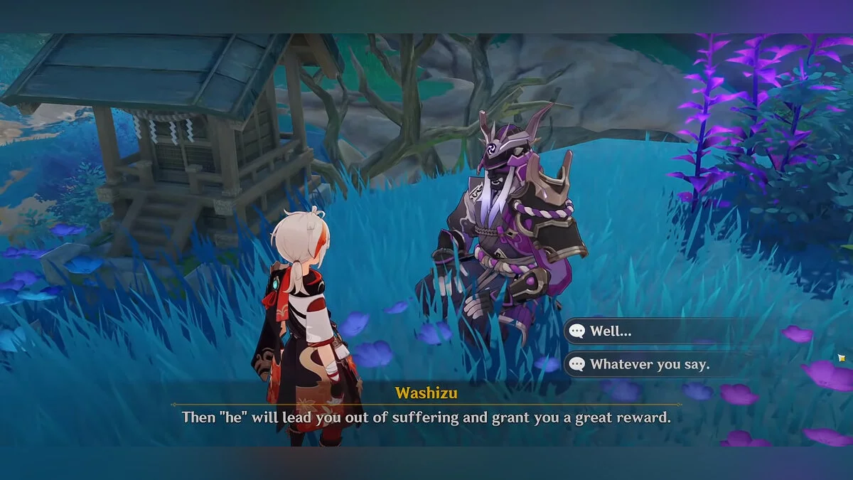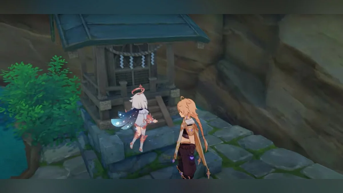 Еще одно «регулярное задание» находится на острове Яшиори (Yashiori Island). Переместитесь на него через телепорт и спрыгните с горы с помощью крыльев. Спланируйте к небольшому святилищу, которое находится на возвышенности прямо по курсу. Около святилища сидит самурай, который предложит вам трижды помолиться. В процессе взаимодействия со святилищем будут появляться искры (три), которые создадут сундук с наградой.