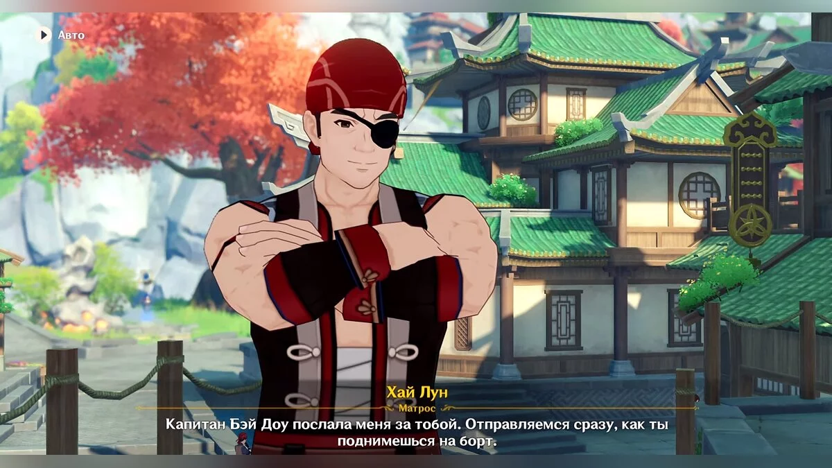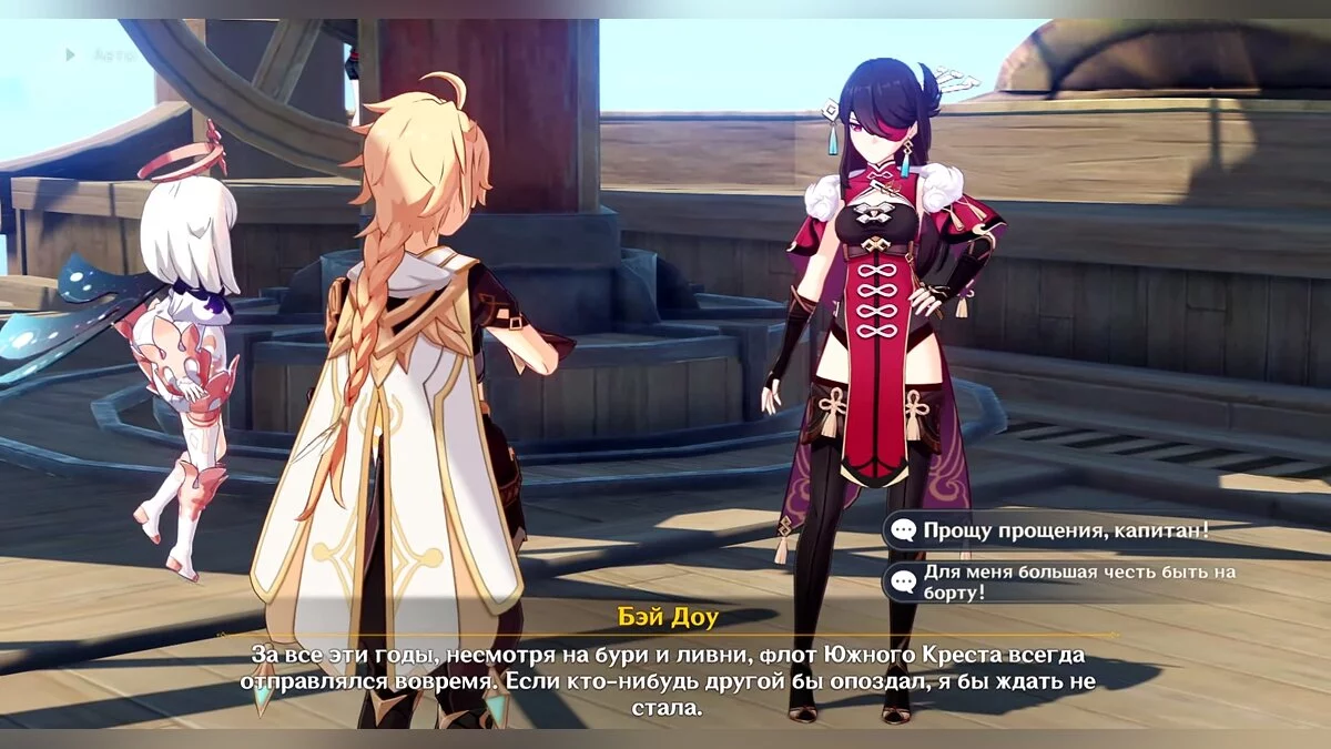 Разговариваем с Бэй Доу, которую найдём в передней части корабля возле рулевого колеса. После небольшого видеоролика судно Алькор отплывёт от берегов текущего региона и доставит персонажа до Инадзумы.