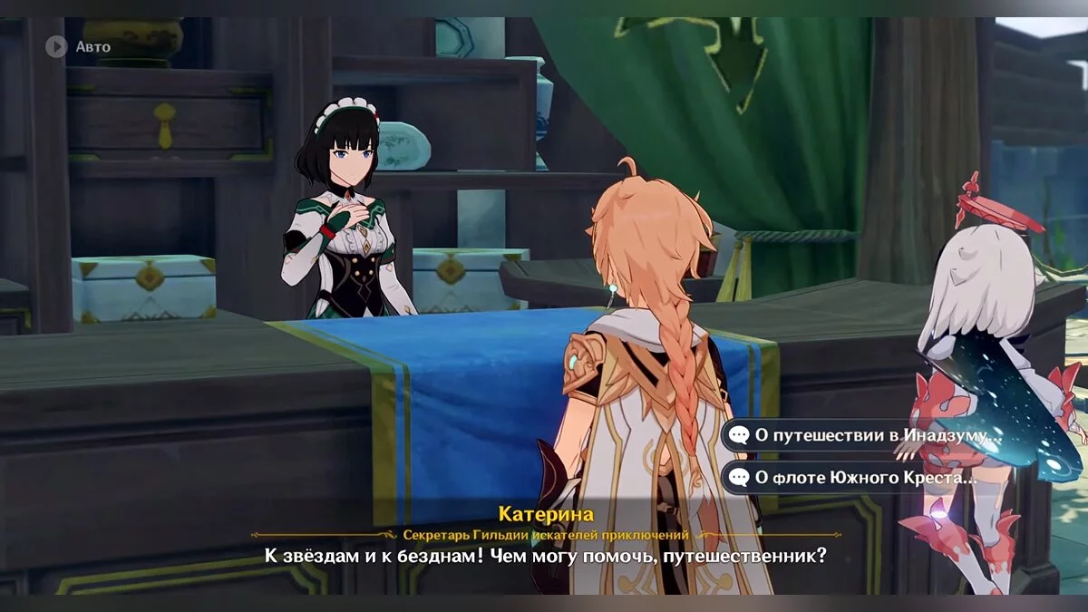 Следуем по маркеру и находим Катерину из гильдии искателей приключений. Выбираем реплику «О путешествии в Инадзуму», чтобы узнать у неё о поездке и продолжить задание.