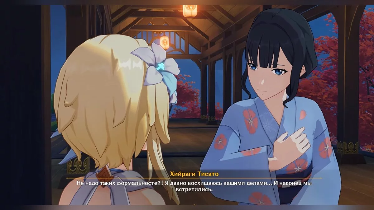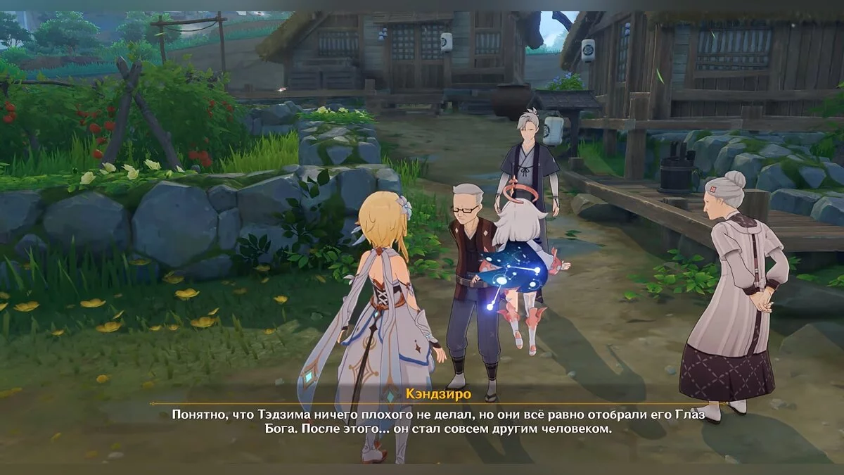 Следуем к чайному домику и разговариваем с Томой. Осматриваем статую на улице и узнаём от мужчины несколько историй о всевидящем божестве. Новый друг отведёт путешественника к девушке по имени Камисато Аяко. Она попросит защитить народ Инадзумы, поэтому игроку придётся выполнить несколько поручений. По завершении диалога получаем долгожданную награду за выполнение задания и отправляемся дальше.