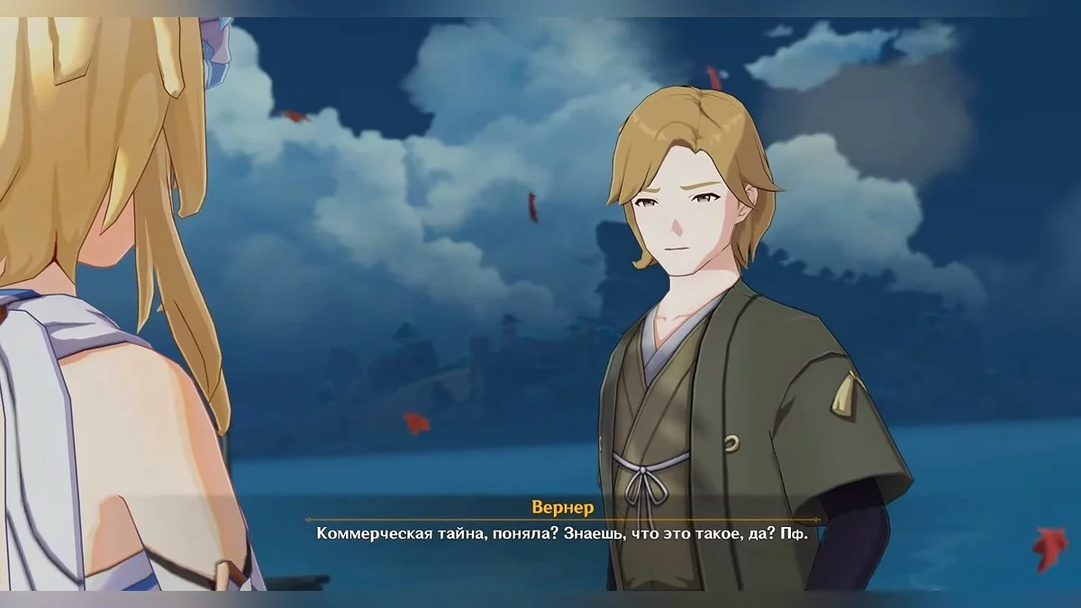 Отправляемся по маркеру и знакомимся с наглым торгашом Вернером. Повлиять на него никак не получится, поэтому возвращаемся в город и снова общаемся с Томой. Новый друг расскажет немного о прошлом торговца. Этой информации будет достаточно для продвижения по заданию дальше, поэтому следуем к Вернеру и отдаём ему по одному предмету из королевства Ли Юэ и Мондштадта. Мужчина расскажет путешественнику о Кэйдзиро, который заставляет его продавать товары по завышенным ценам. Следуем к указанной на карте точке в поисках следов Кэйдзиро.