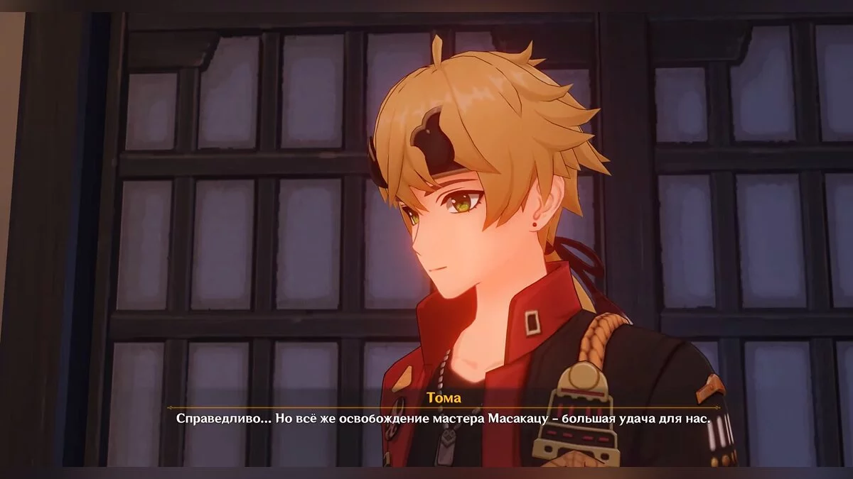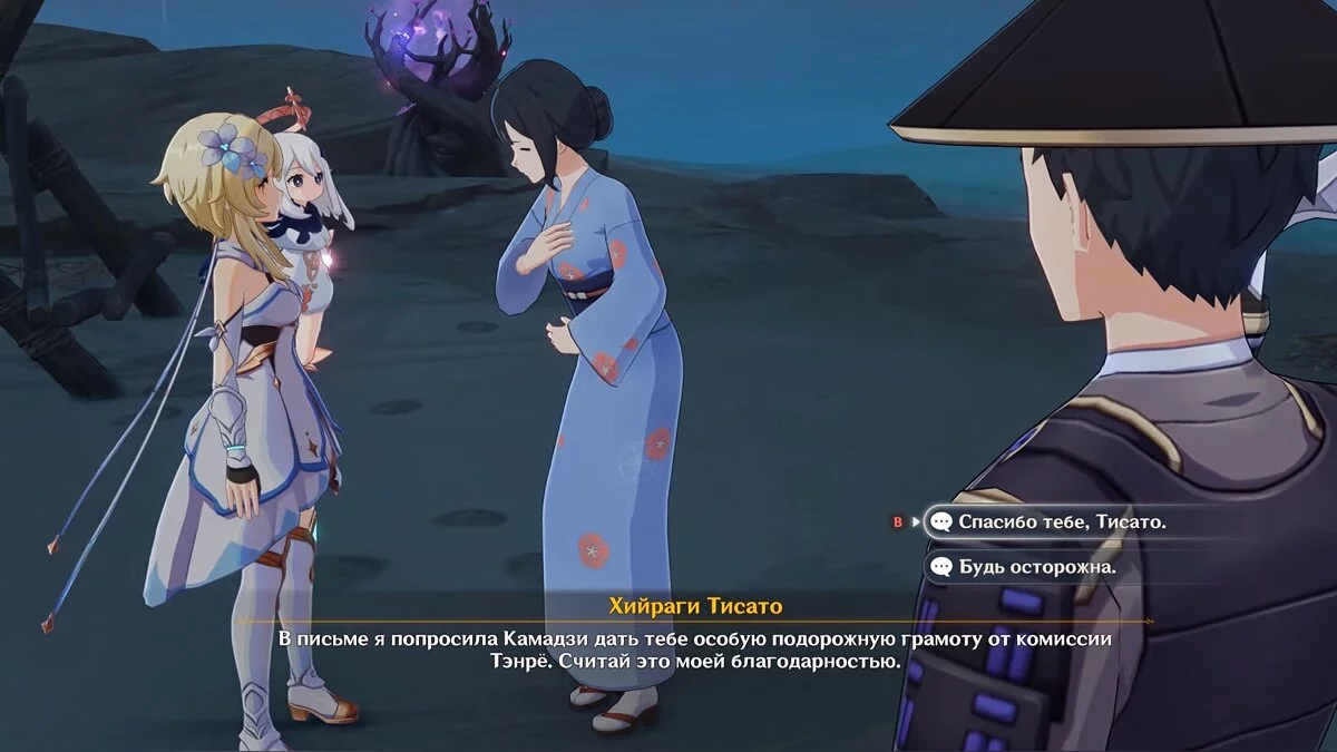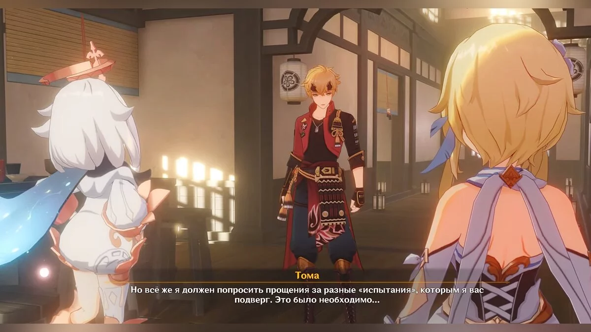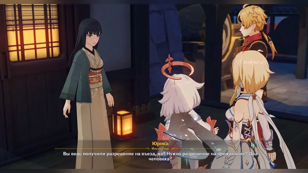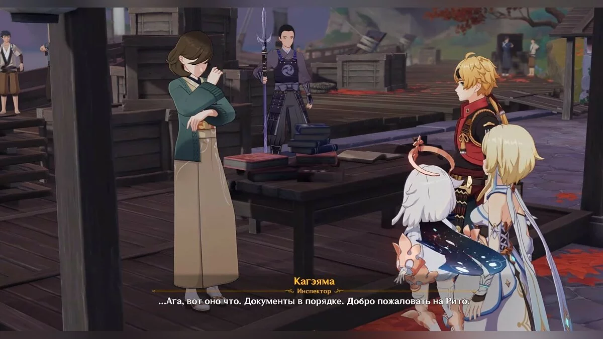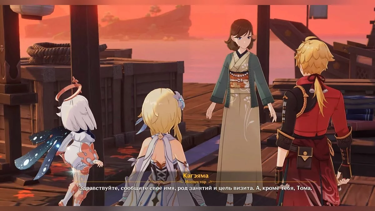 Впервые прибывшим на острова Инадзумы путешественникам после знакомства с Томой необходимо зарегистрироваться в соответствующей инспекции. Следуем к метке и общаемся с Кагэямой. Выбираем любые варианты ответа, пока Тома не достанет документы героя и Паймон.