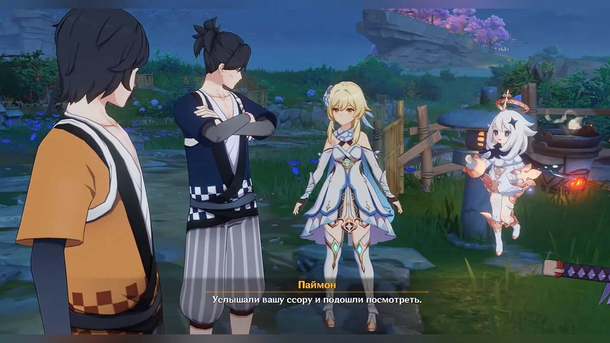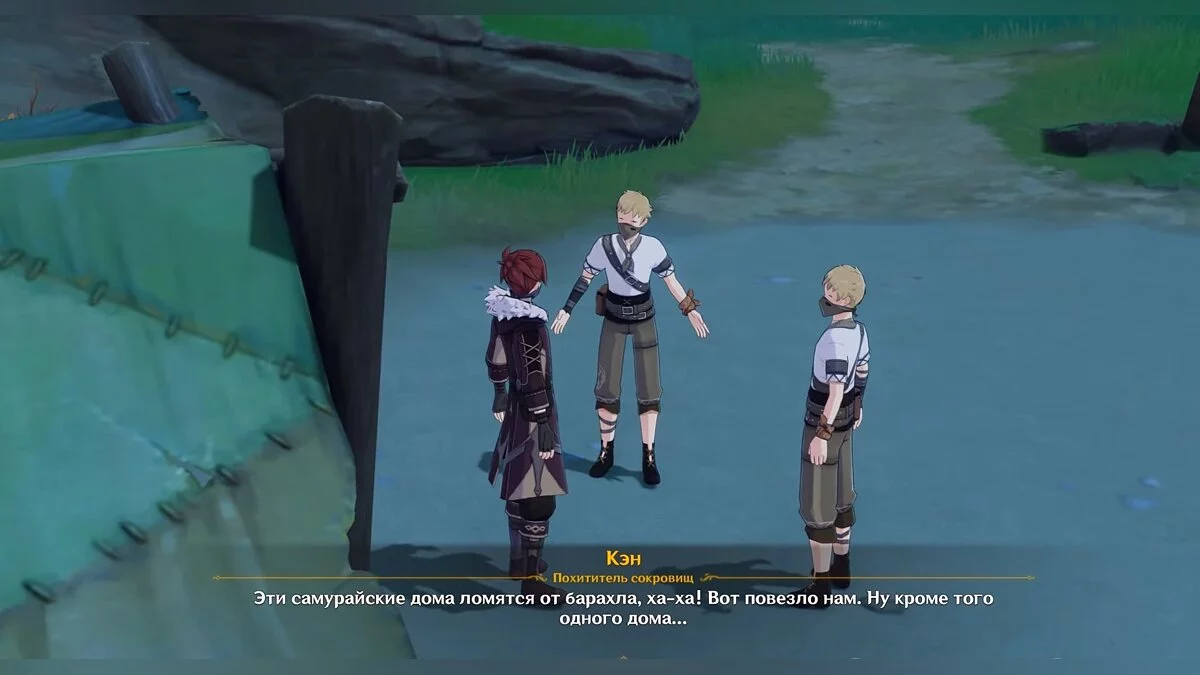 Двигаемся к отметке на карте для поисков следующего жителя. Путешественник застанет ссору двух жителей Инадзумы с самураем Куросавой Коносукэ. Расспрашиваем могучего воина о Глазе Бога и бежим к следующей точке для поимки Похитителей сокровищ.