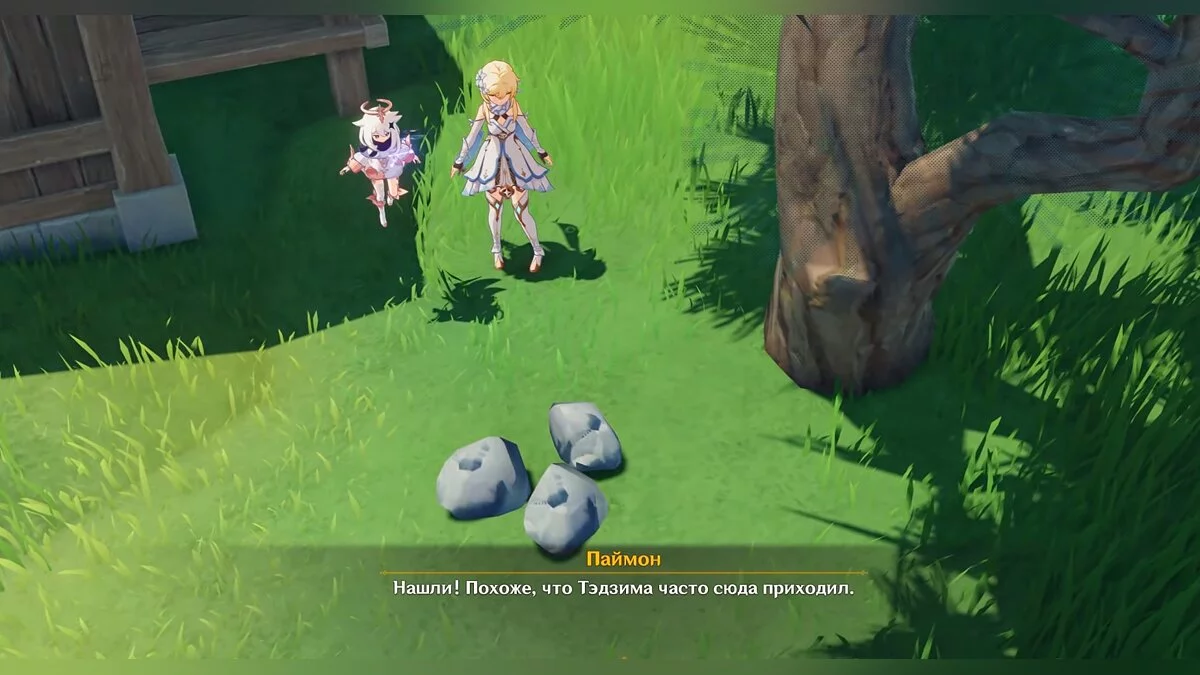 Паймон предположит, что на предмете мог остаться элементальный след, поэтому используем чувство стихий и двигаемся за фиолетовой дымкой, которая приведёт путешественника к трём камня за домом.