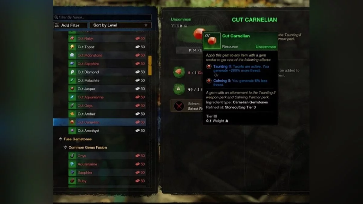 В игре есть специальные драгоценные камни, которые при ставке в оружие наделяют его дополнительным эффектом. На данный момент в игре насчитывается 14 типов камней, которые имеют самые разные бонусы — от увеличения урона конкретного типа урона (например, огненного или ледяного) до увеличения шанса крафта более ценной вещи.