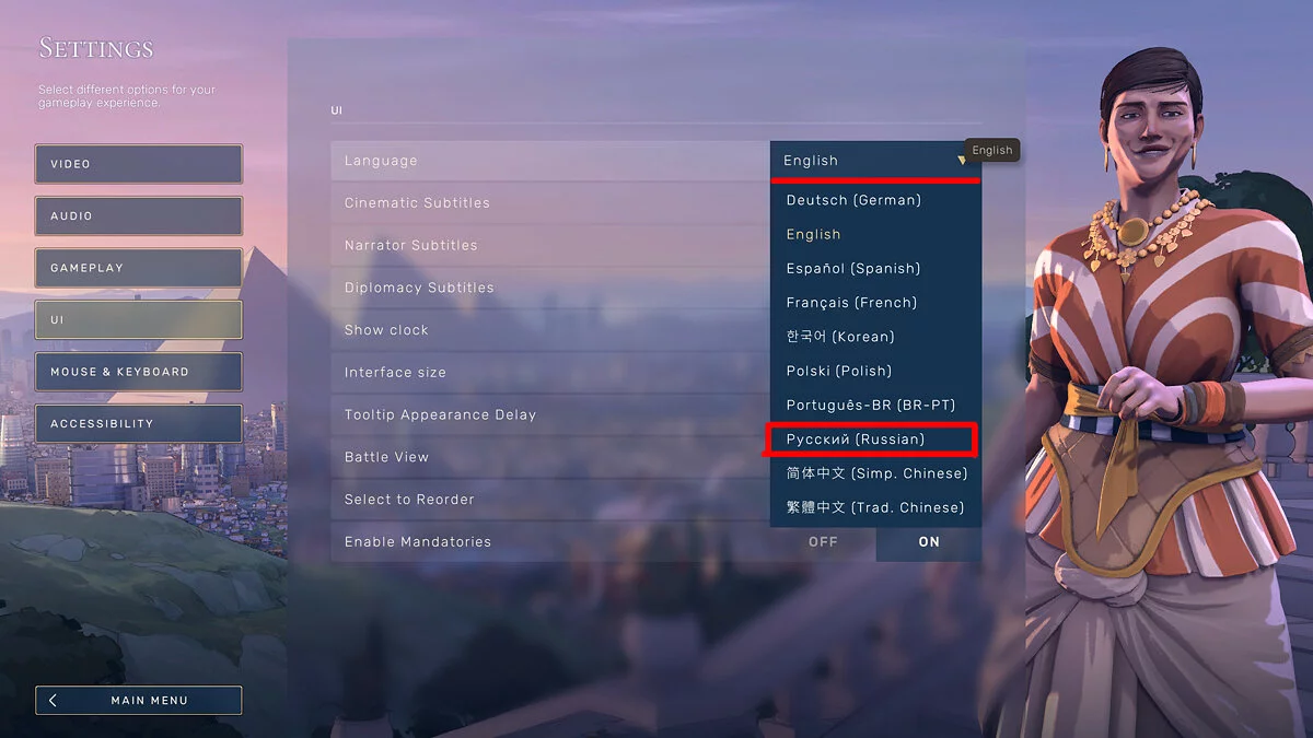 При установке игры можно выбрать русский язык. Если вы этого не сделали, то игра запустится на английском. Чтобы изменить язык, зайдите в раздел «Настройки» (Settings) / «Интерфейс» (UI). В первой строчке меню поменяйте язык на русский и перезапустите игру.