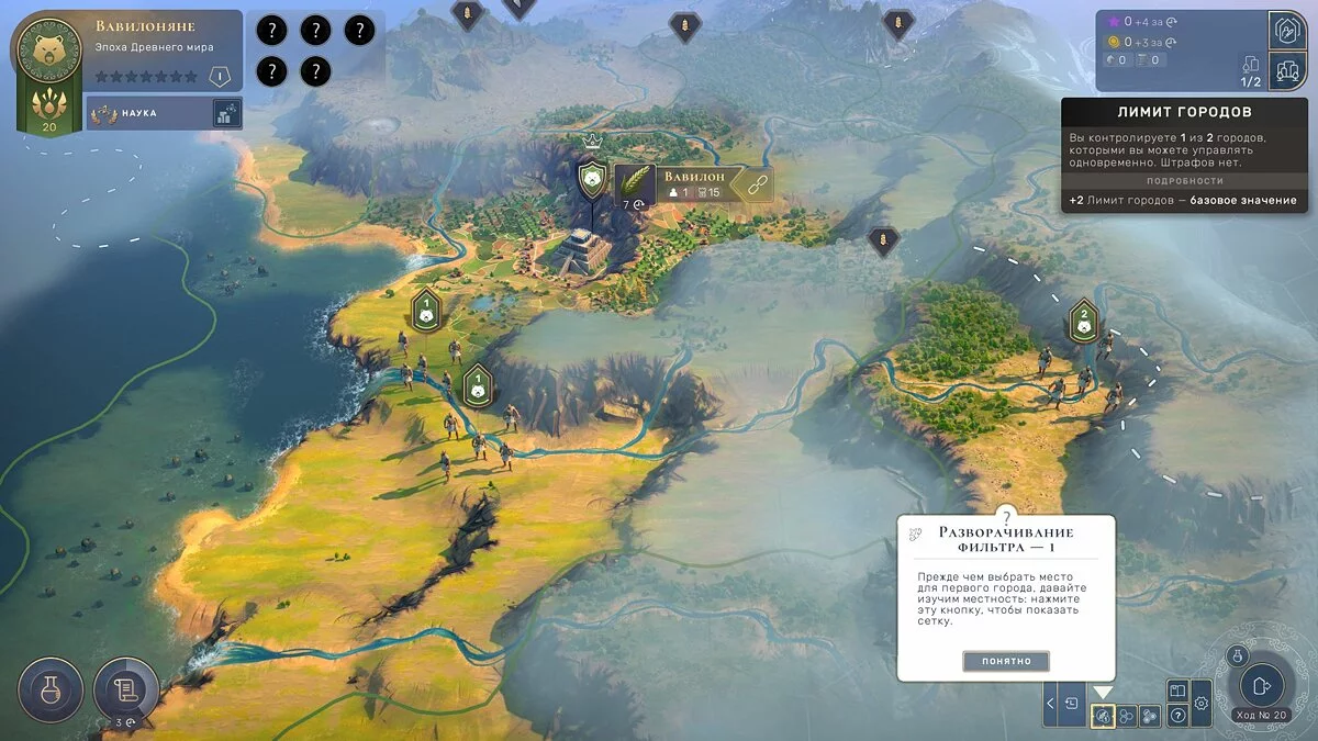 В Древнюю Эру ваша империя будет начинать развиваться с двумя городами. К сожалению, это число не увеличивается по мере того, как вы доходите до следующих эпох. Вместо этого вам нужно будет увеличить лимит городов с помощью различных исследований.