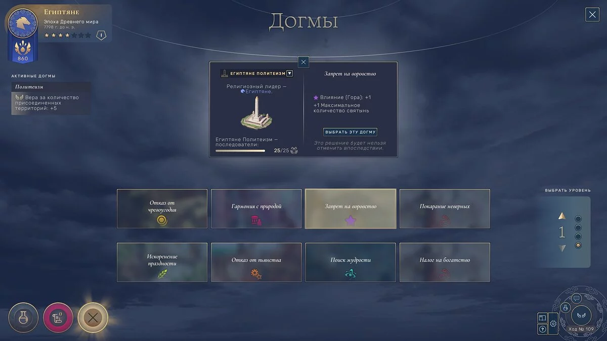 Приняв необходимую догму, вы сможете получить бонусы к влиянию. К примеру, выбрав «Запрет на воровство», вы сможете получать на 1 единицу больше влияния через горы.