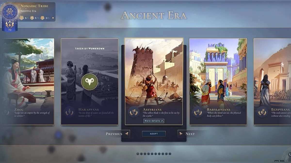 Однако собрать абсолютно все звёзды эры на поздних этапах не получится — в этом случае вы будете двигаться по эпохам слишком медленно и рискуете отстать от других цивилизаций. Лучше сосредоточьтесь на тех звёздах, которые соответствуют выбранной культуре и вашей тактике. К тому же, за них вы получите больше славы. Например, агрессивным захватчикам стоит выбирать награды, которые связаны с армией и экспансией соседних земель. Также имейте ввиду, что если вы сохраняете свою культуру при переходе в новую эпоху, то получаете 10%-ный бонус к очкам славы. Он будет сохраняться, пока вы не решите сменить культуру на другую.