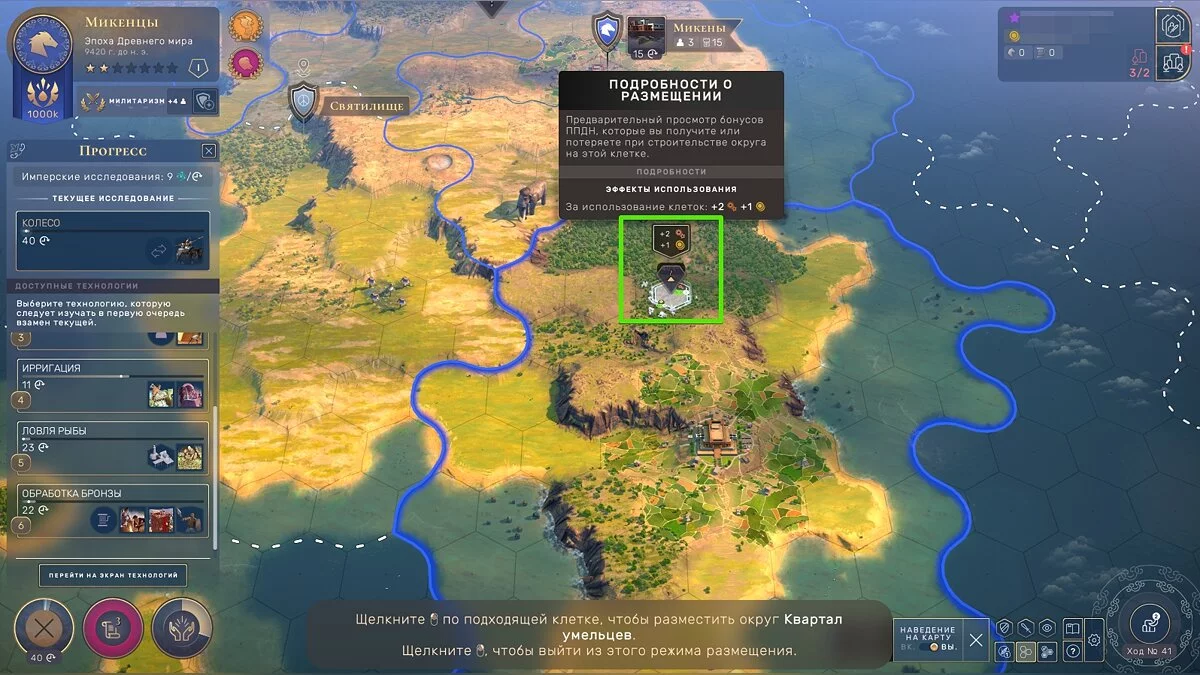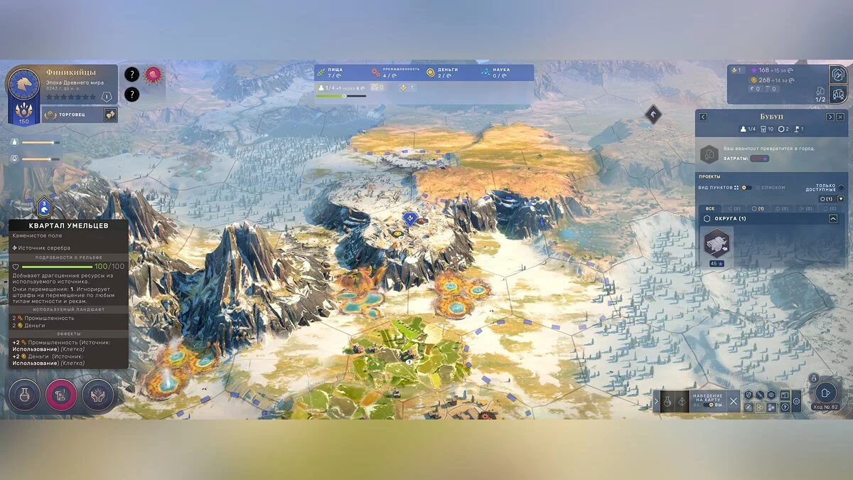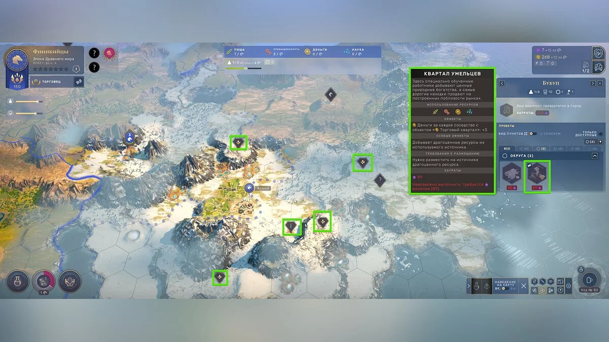 После этого изучите необходимые технологии (если потребуется) или воспользуйтесь уже доступными. Например, с самого старта игры вы можете устанавливать «Кварталы умельцев» в таких местах, как лес, каменистые поля и локации с сухой травой.