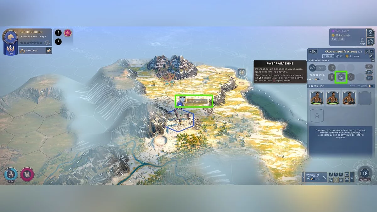Во время исследования открытого мира вы можете наткнуться на такие объекты интереса, как «Святилища». Чтобы получить некоторые ресурсы из таких объектов, в том числе и деньги, вам нужно разграбить их. Отправьте отряд разведчиков в клетку со святилищем, нажмите на отряд и выберите пункт «Разграбление».