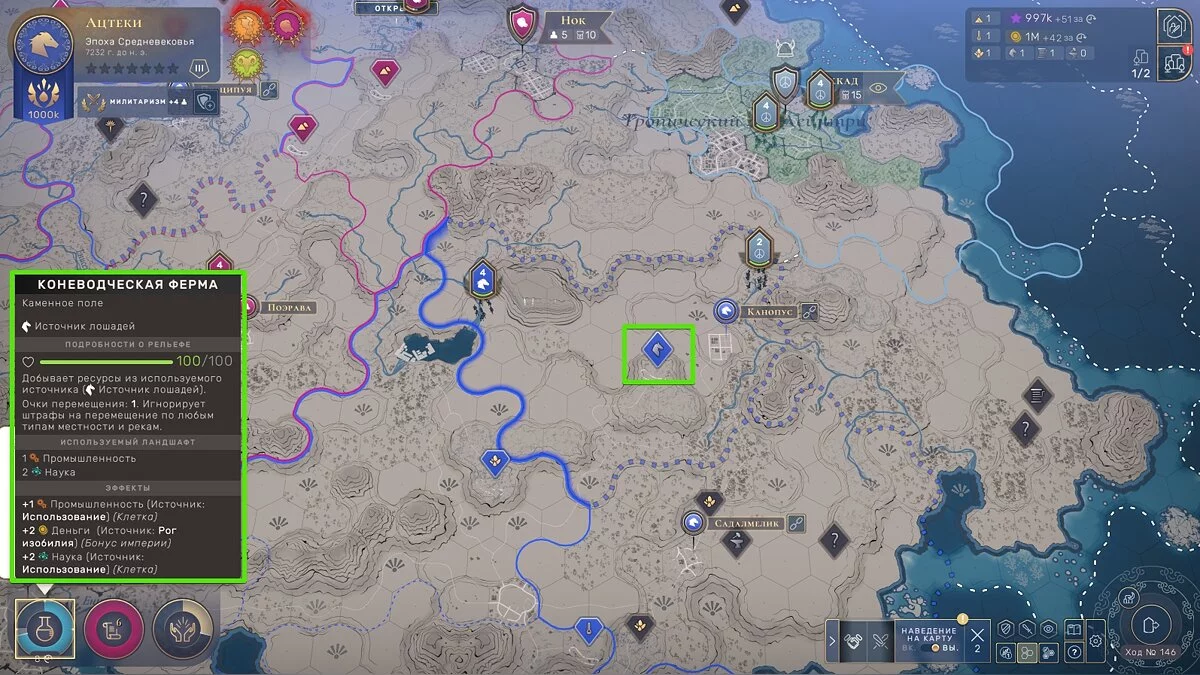 Стратегические ресурсы разбросаны по глобальной карте с самого старта игры. Их местоположение фиксированное. Во время исследования глобальной карты вы будете находить каменистые поля, залежи меди, коневодческие фермы, клетки с сухой травой и другие локации с залежами стратегических ресурсов.