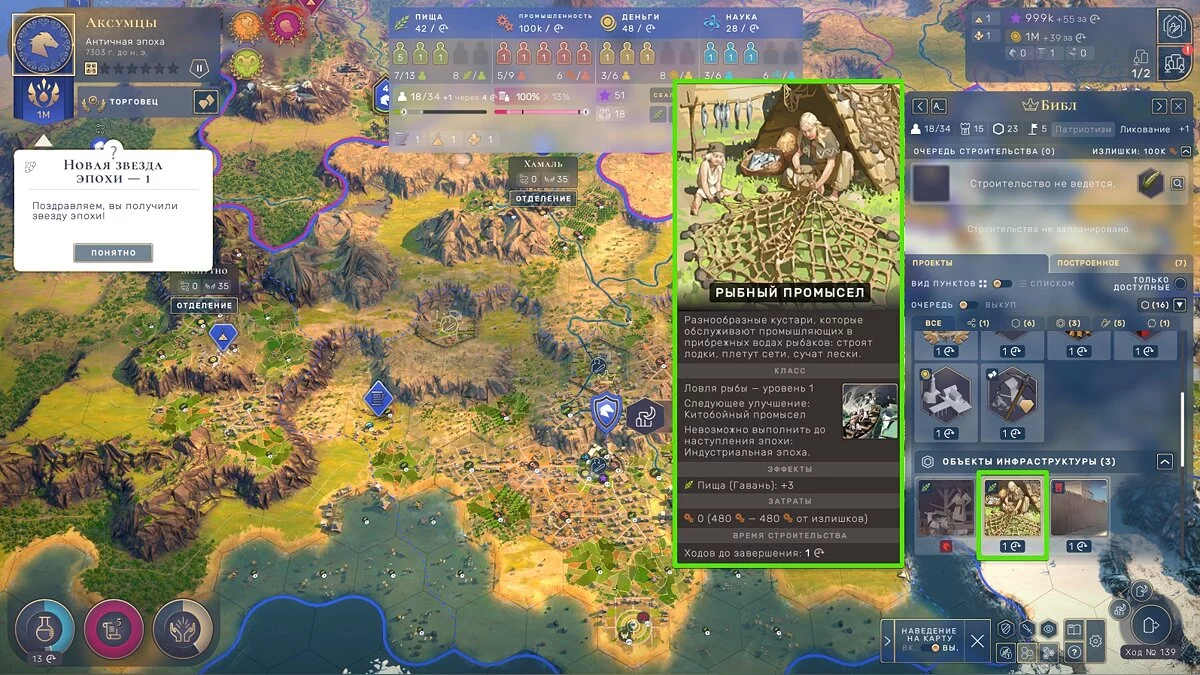 После установки гавани вы сможете построить объект инфраструктуры «Рыбный промысел». Установленные объекты будут приносить вам по (+3) единицы пищи каждый последующий ход.