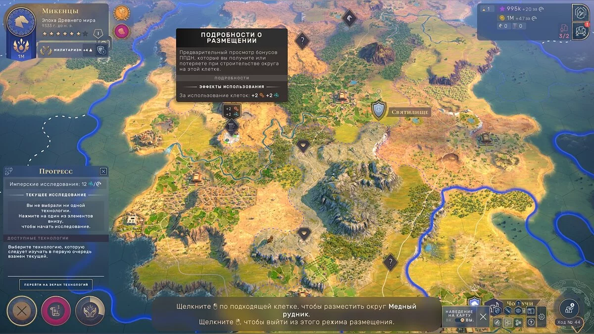 Для добычи меди и серебра понадобится изучить технологию «Обработка бронзы» и построить «Медный рудник» на любом из аванпостов, который расположен рядом с крупными залежами металлов или минералов. После строительства, «Квартал умельцев» превратится в «Медный рудник», который будет приносить вам по (+3) единицы науки и добываемый стратегический ресурс.