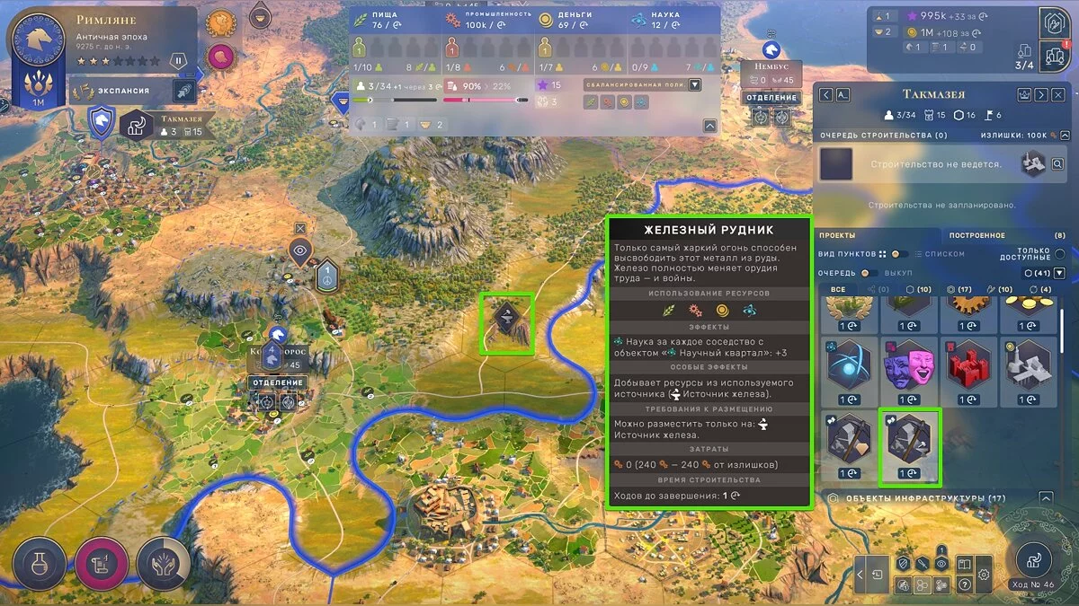 Также обращайте внимание на доступные объекты инфраструктуры. Они будут обновляться по мере изучения новых технологий. Не стоит пренебрегать этим советом, так как некоторые объекты могут принести вам не только дополнительные очки науки или промышленности, но и добавить денег в вашу казну.