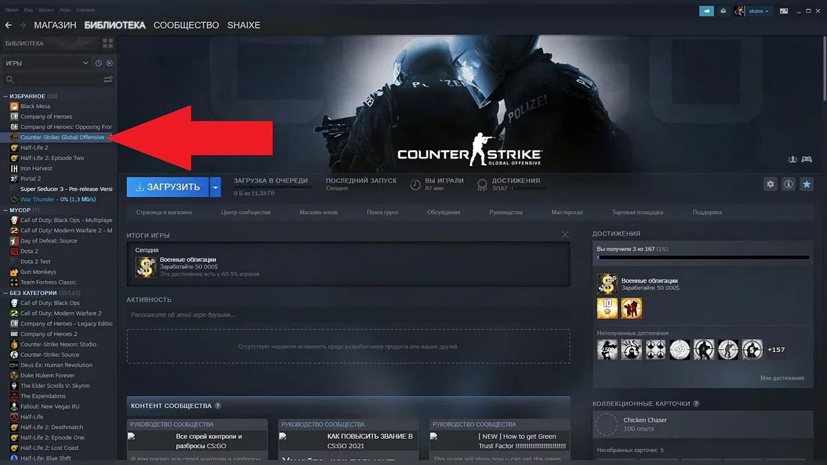 - Запустите Steam, откройте «Библиотеку» и найдите CS2.