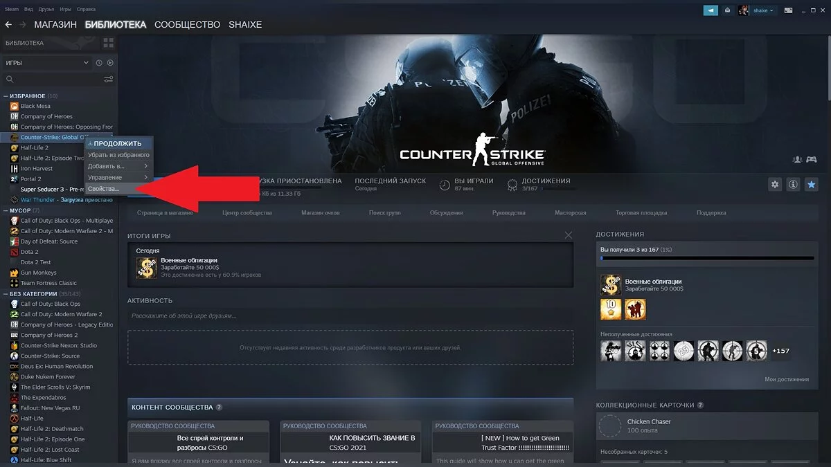 - Нажмите на игру правой кнопкой мыши и выберите пункт «Свойства».