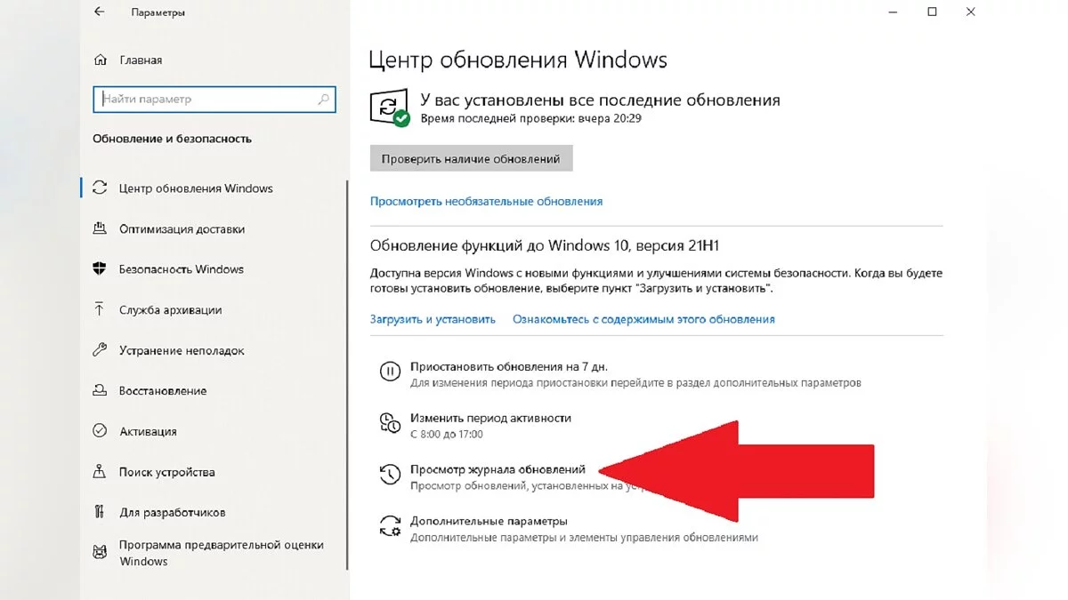 - Откройте журнал обновлений. Чтобы найти его, нажмите кнопку Windows, выберите пункт «Параметры» (шестерёнка), затем — «Обновления и безопасность», «Центр обновления Windows» и, наконец, «Просмотр журнала обновлений».