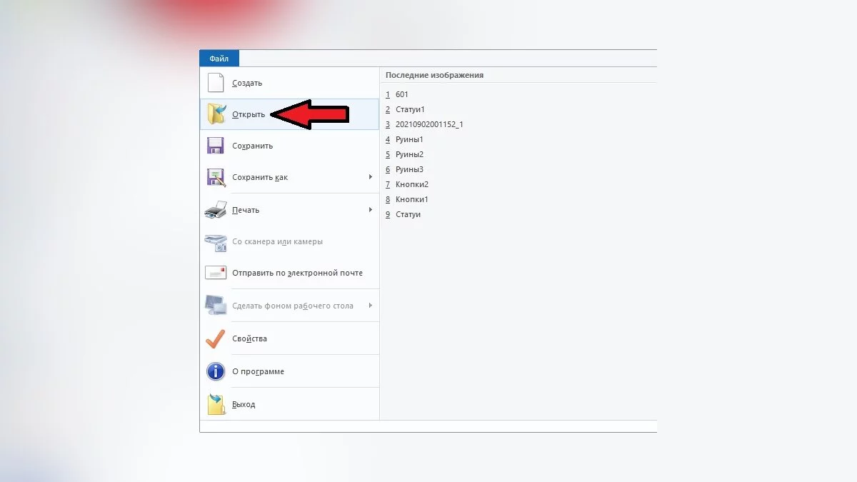 Запустив Paint, загрузите в программу выбранное изображение. Для этого нажмите на «Файл» — «Открыть»: