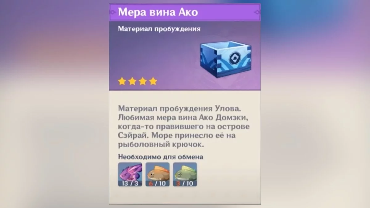 Также для возвышения древкового оружия «Улов» потребуется получить предмет «Мера вина Ако», который тоже обменивается в Ассоциации рыболовов Инадзумы. Для этого необходимо поймать следующую рыбу: