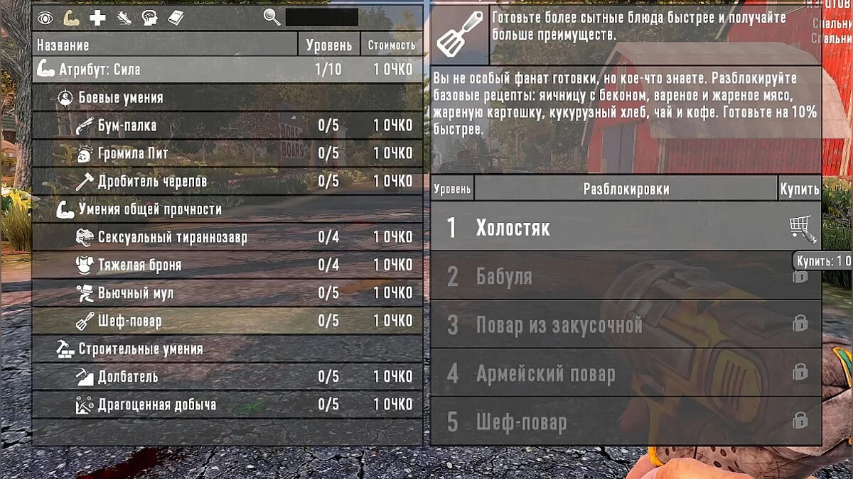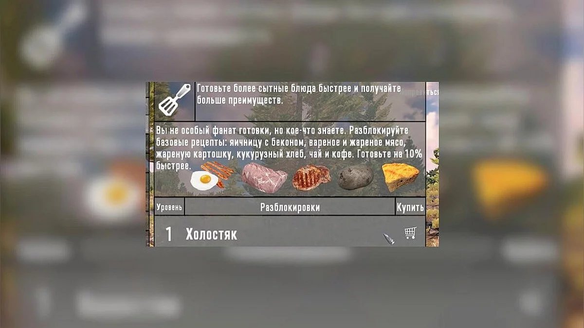 1. И первый навык который я хочу тебе посоветовать вкачивать — ЭТО ШЕФ-ПОВАР. Данный навык я очень рекомендую, ибо благодаря всего одному перку из ветки этого навыка ты сможешь готовить сразу намного больше блюд чем без него, а это верный залог выживания! Благодаря одному перку тебе будет сразу доступна готовка таких блюд как: жаренное и варенное мясо, что намного лучше чем подгоревшее, а а так же кукурузный хлеб, яичница с беконом, чай, кофе, и жаренный картофель.