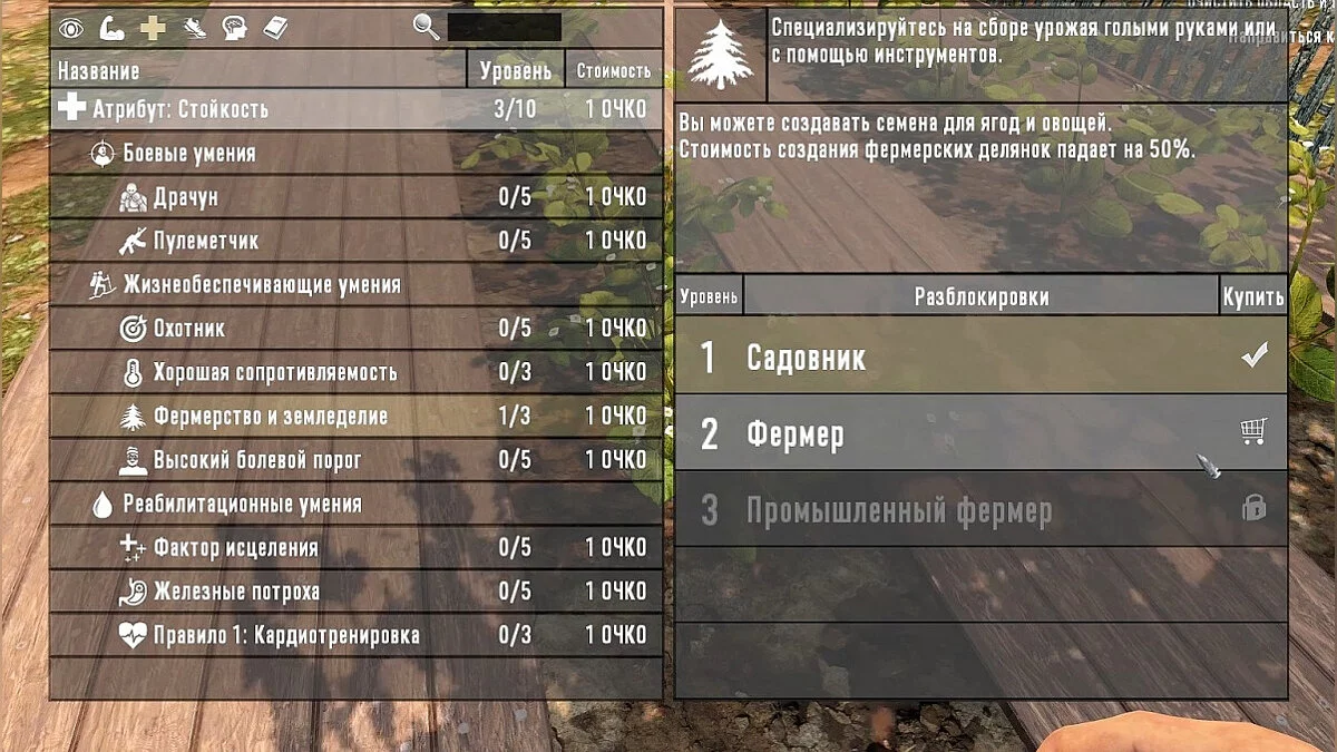 2. Навык «Фермерство и земледелие», тут я порекомендую вам прокачаться сразу до 2-го перка под названием «ФЕРМЕР». Благодаря этому навыку мы не только сможем собирать ВДВОЕ больше плодов с любых растений и овощей, но и создавать семена этих растений, а далее рассаживать их у своей базы, при этом стоимость изготовления так называемых «фермерских делянок» упадет на 30%, т.е нам потребуется меньше ресурсов для ее изготовления. Да, конечно придется прокачать «Стойкость» до 5 уровня, но цена каждого составляет всего 1 очко, так что прокачаться мы сможем достаточно быстро, но а самое главное — мы по сути навсегда забудем что такое голод и дефицит продуктов, так что советую начинать прокачивать данный навык как можно раньше!