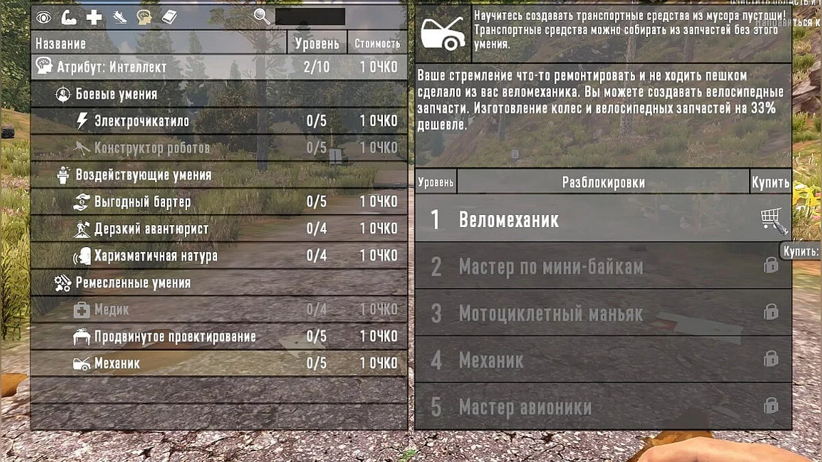 3. Третий навык под названием «Вело механик» можно получить в самом начале игры, потратив всего 2 очка навыков, но ценность этого навыка очень велика, поскольку нам будет доступно изготовление велосипеда, а это уже какой-никакой ТРАНСПОРТ, и нам не придется ходить пешком, особенно если у вас не прокачан навык «Вьючный мулл», плюс у велосипеда есть пусть и небольшое, но все же «хранилище», в котором мы можем хранить не поместившиеся в инвентарь ПРЕДМЕТЫ.