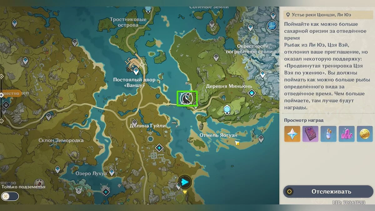 Отправляйтесь в отмеченную на карте область и найдитее Цзя Вэй, мастера рыбалки из Ли Юэ. Он даст вам задание для первого испытания. Вы должны отправиться к мосту рядом с деревней Миньюнь и поймать как можно больше сахарных оризий за отведённое время. Предварительно мы рекомендуем посетить Мондштадт или Ли Юэ, чтобы воспользоваться алхимическим столом и скрафтить наживку.