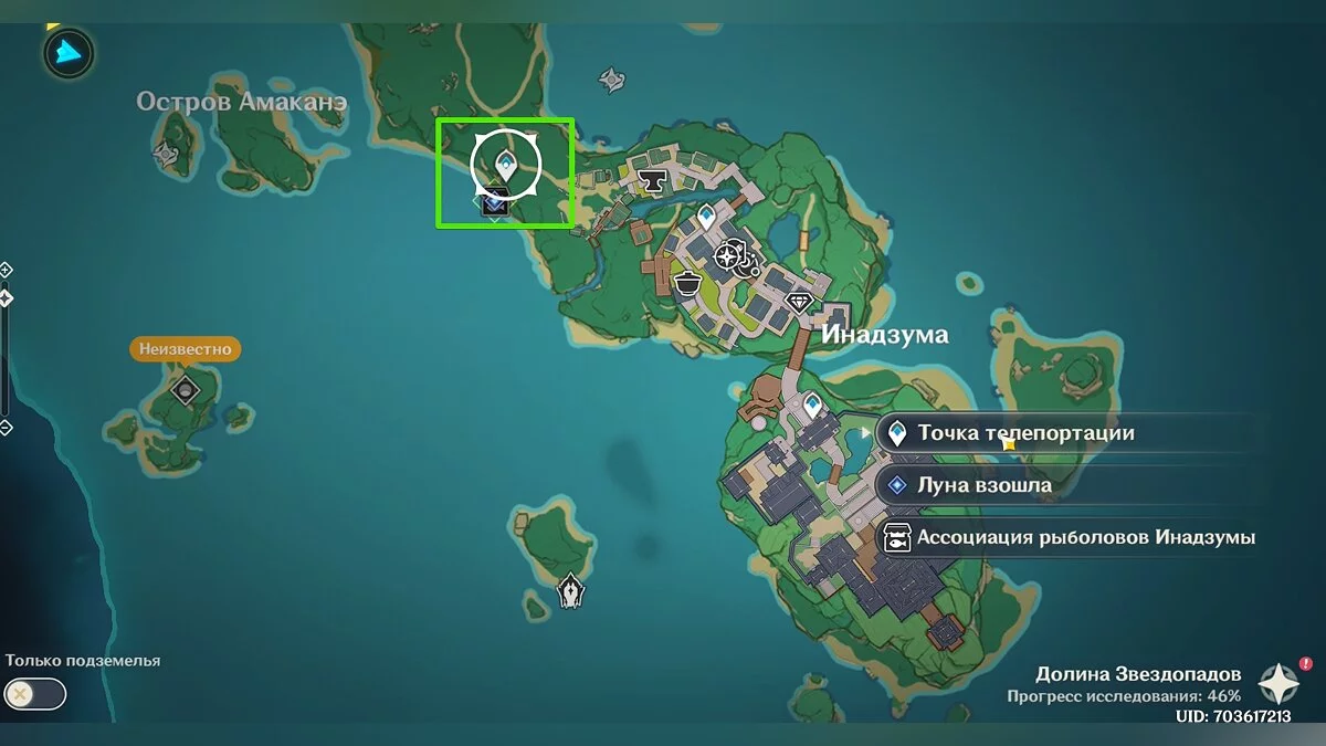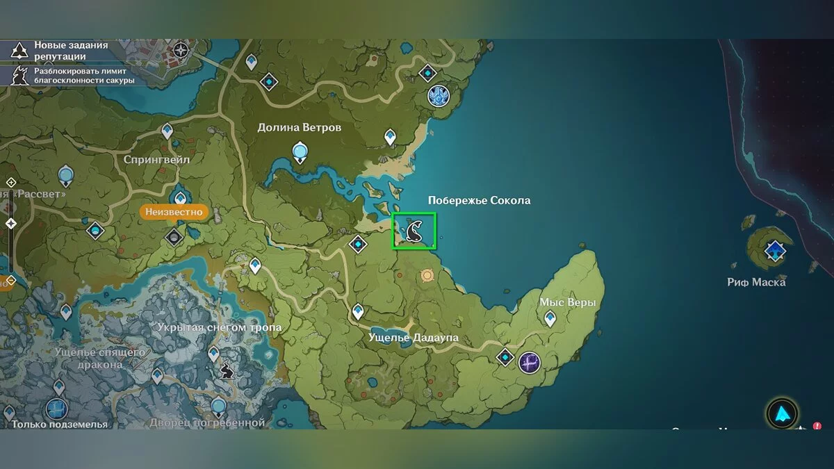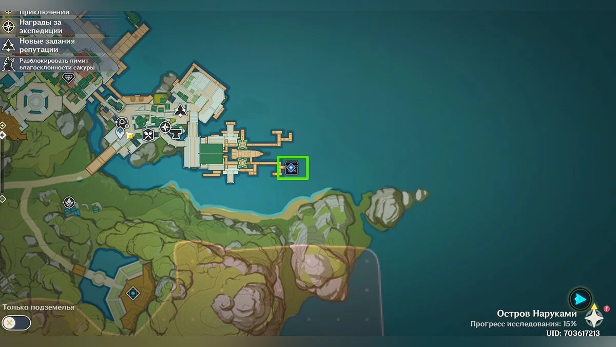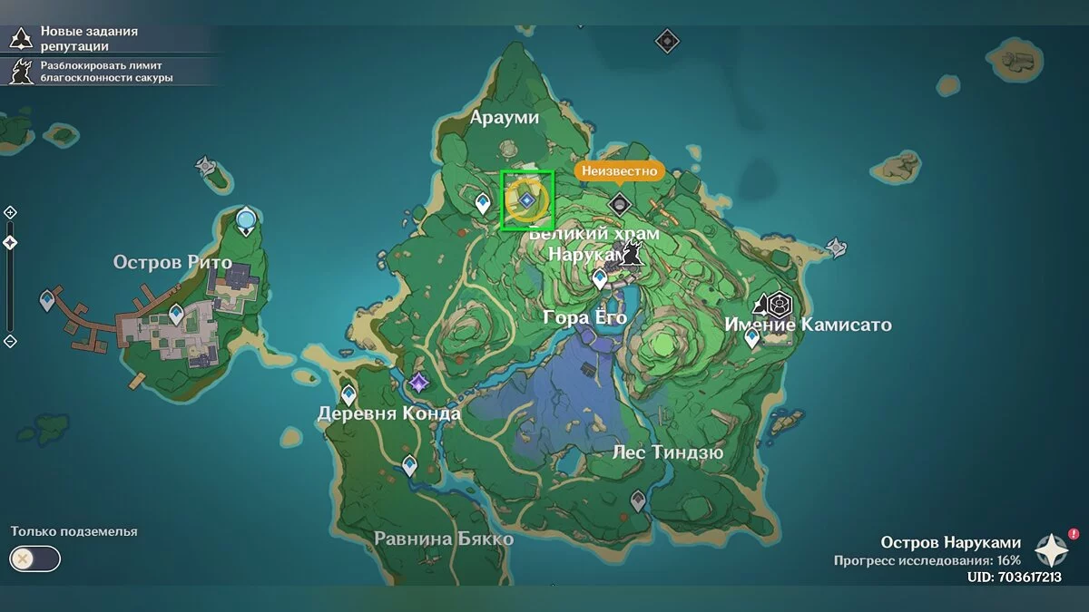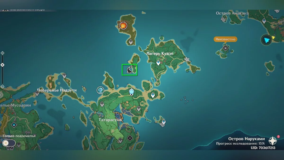 Откройте журнал задач и выберите одноимённое дополнительное задание. Вам стоит вернуться на Инадзуму и вновь пообщаться с местным мастером рыбалки. Кудзирай попросит вас отыскать особую магическую кристальную руду возле региона «Арауми». Мы указали нужное место на скриншоте ниже. Если вы уже посещали эту область ранее, то можете воспользоваться телепортом для быстрого перемещения.