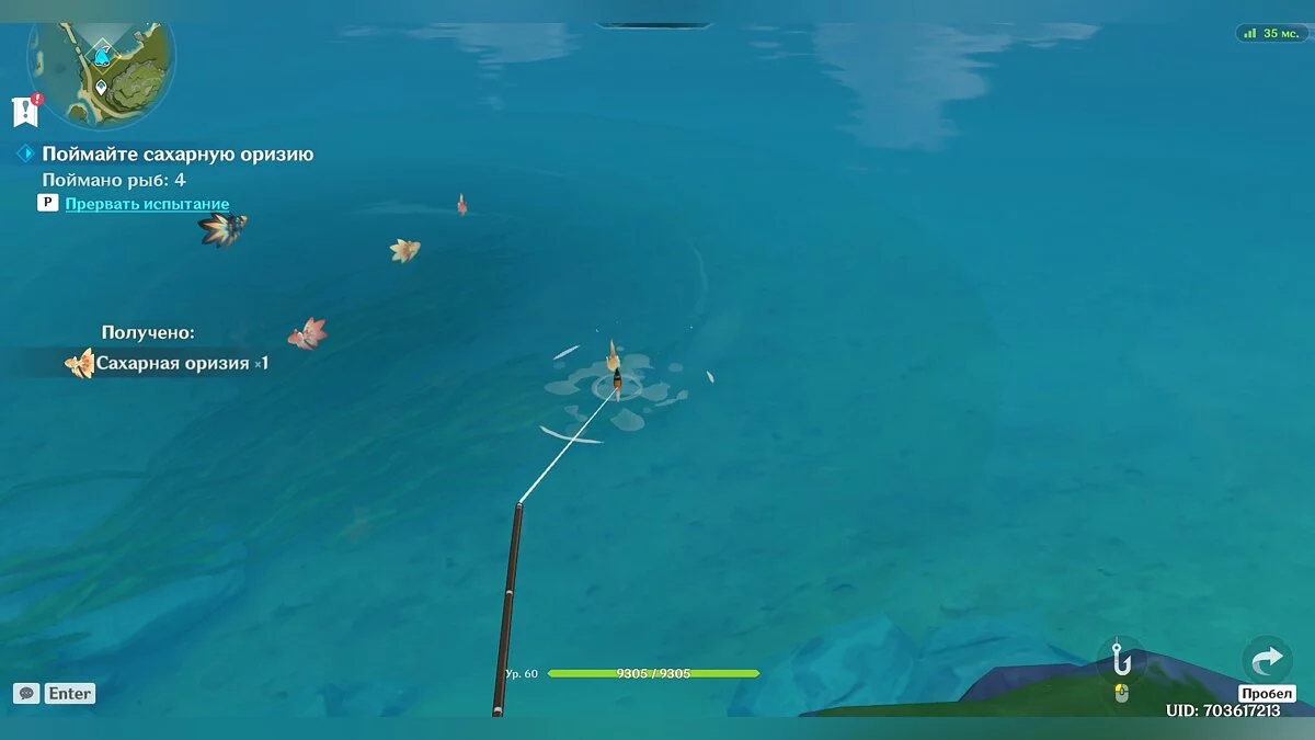 Теперь вам нужно поймать пять глазурных оризий. Глазурная оризия — это небольшая рыбка фиолетового цвета. Не спутайте её с кристальной рыбой, которая водится в этом же водоёме.