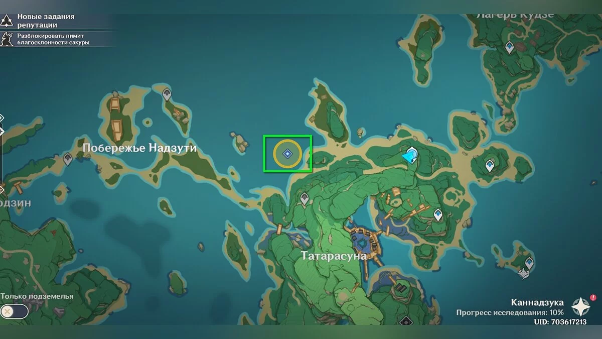 Следующее испытание будет проходить на островах Инадзумы. Вам следует добраться на небольшой остров между лагерем Кудзё и островом Татарасуна.