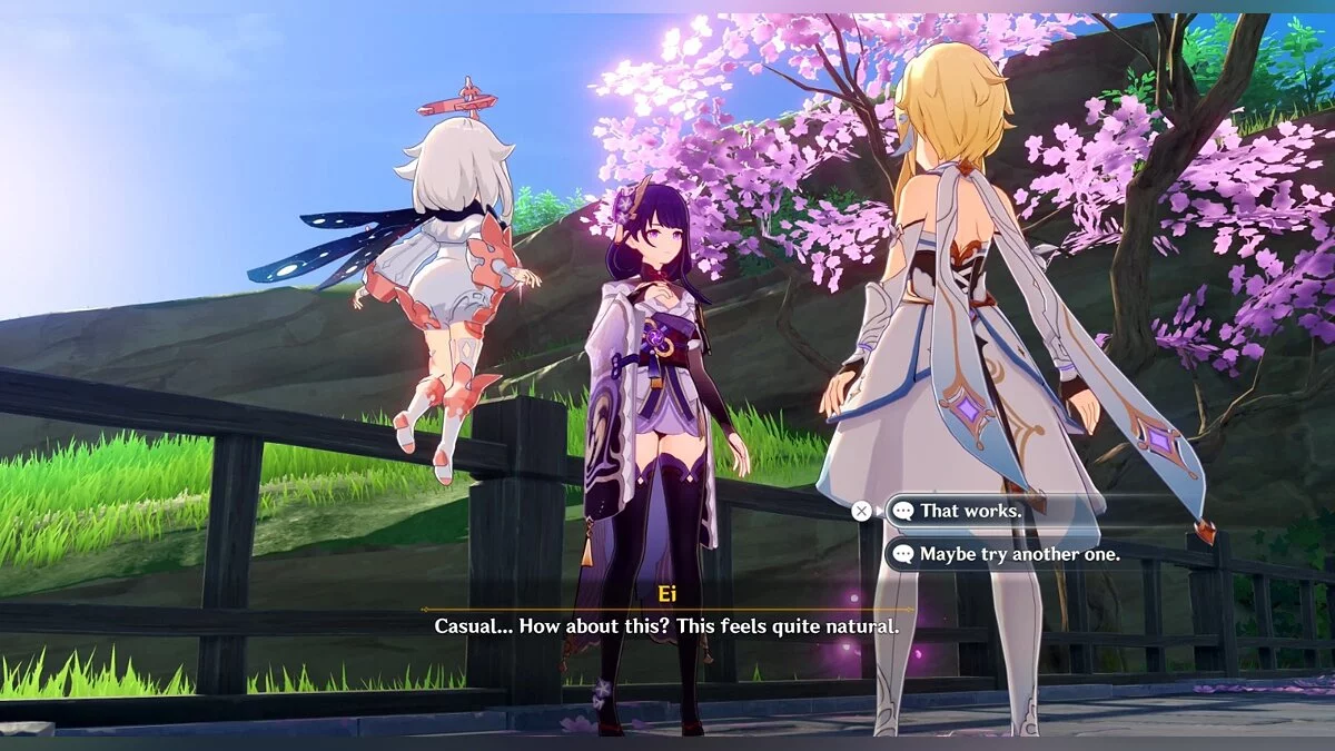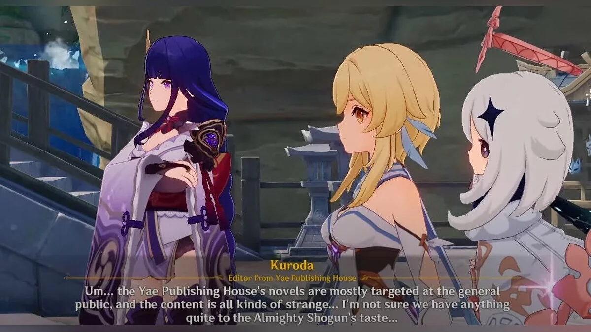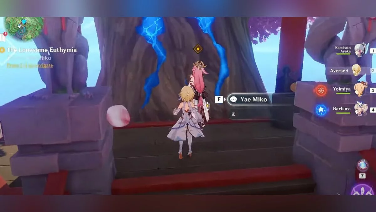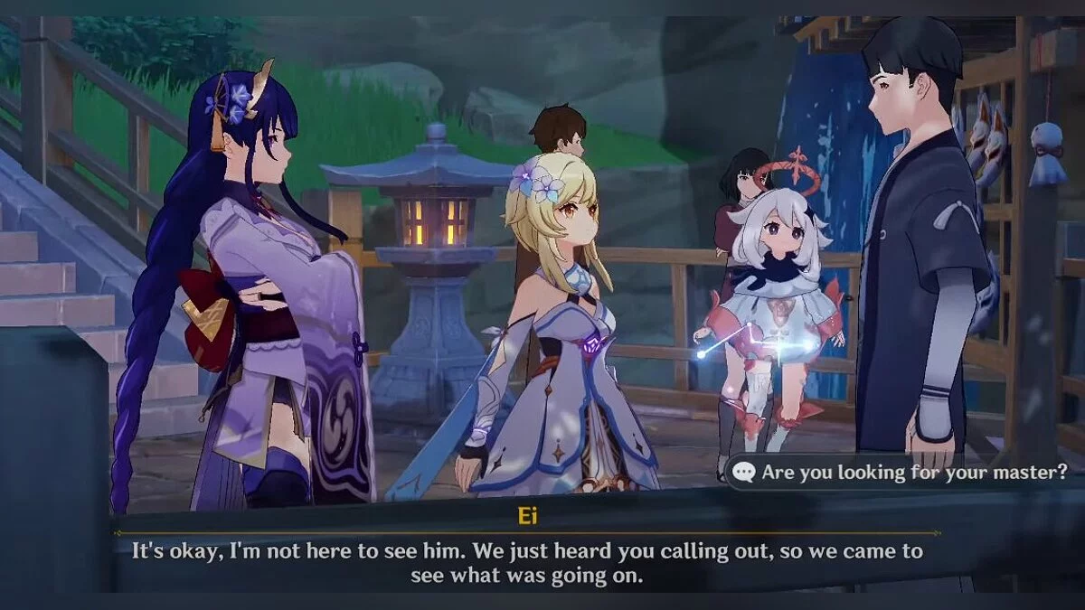 В разговоре с NPC вы поинтересуетесь некоторыми деталями о Сегуне, после чего Эи решит покинуть свой мир и побродить по Инадзуме. Составьте ей компанию, так как девушка не особо знакома с местными достопримечательностями.