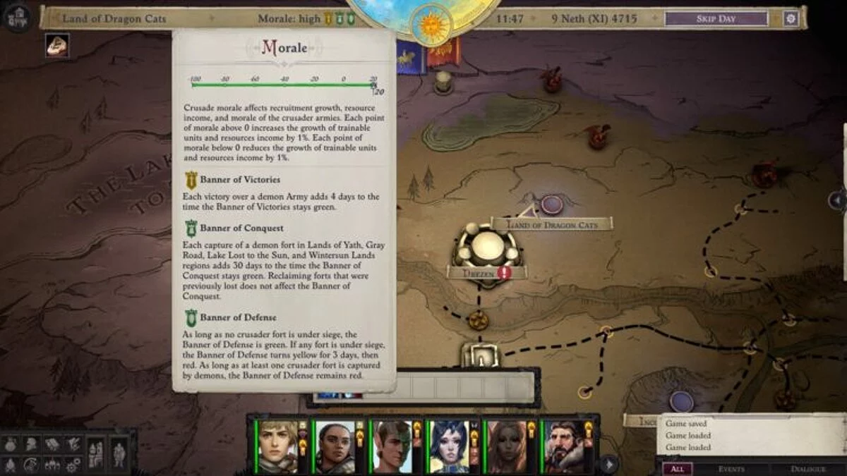 Боевой дух есть у каждой армии и у вашего крестового похода в целом. На отдельно взятый легион влияют события, которые с ним происходят. Если много проигрывать — боевой дух армии упадет и наоборот.