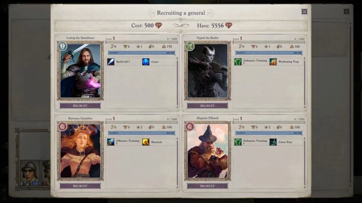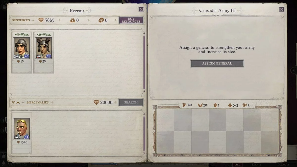 Вы можете потратить деньги, чтобы набрать больше юнитов. Финансовые ресурсы генерируются со временем, а также могут быть получены в качестве вознаграждения за выполнение квестов крестоносцев (победы над армиями демонов, захват фортов и другие). Позже появится возможность строить здания, чтобы увеличить постоянный приток денег. Каждую неделю вы можете нанимать только ограниченное количество определенных юнитов. Новые отряды объединяются в легион, который появляется в Кенабресе (чуть позже в Дрезене, когда вы вернете город).