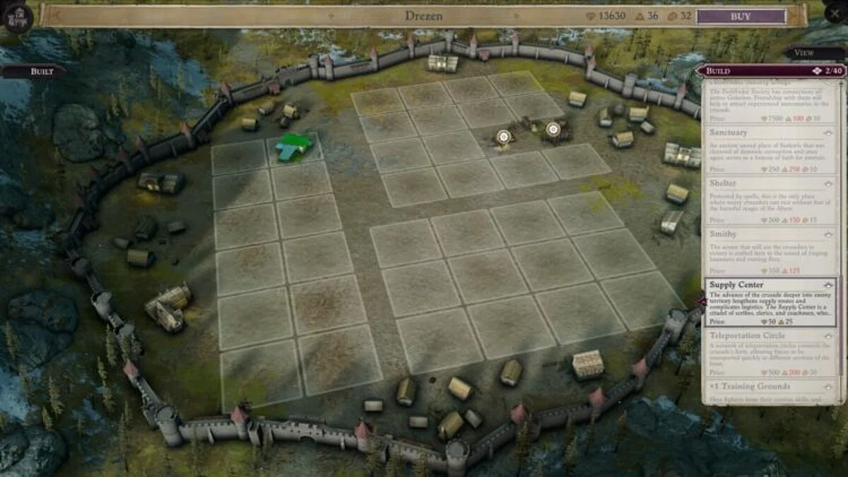 В верхнем левом углу можно открыть ресурсы крестового похода. Финансовые очки — основной ресурс, используемый для набора генералов и юнитов. Сначала деньги можно получить только за успехи в битвах. В последствии их будут приносить различные постройки, бафы и события. Личные средства вашего героя также можно обменять на финансы для военных действий. Очки материалов используются при строительстве обычных построек, а очки энергии для магических или высококлассных сооружений.