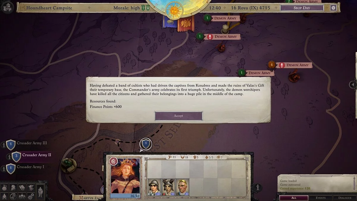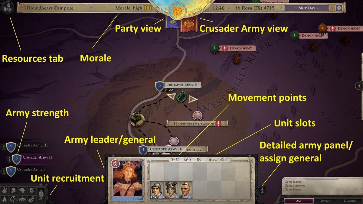 Каждая армия, независимо от того, принадлежит ли она фракции крестоносцев или демонам, имеет показатель мощи, который подскажет, насколько она сильна. Следует избегать сражений, если у врагов более высокая мощь, чем у вас. Попробуйте найти другой способ добраться до места назначения, иначе рискуете потерять ценных солдат. При правильном билде и продуманной стратегии победить более сильных врагов реально, но просчитать свои действия заранее будет сложнее.