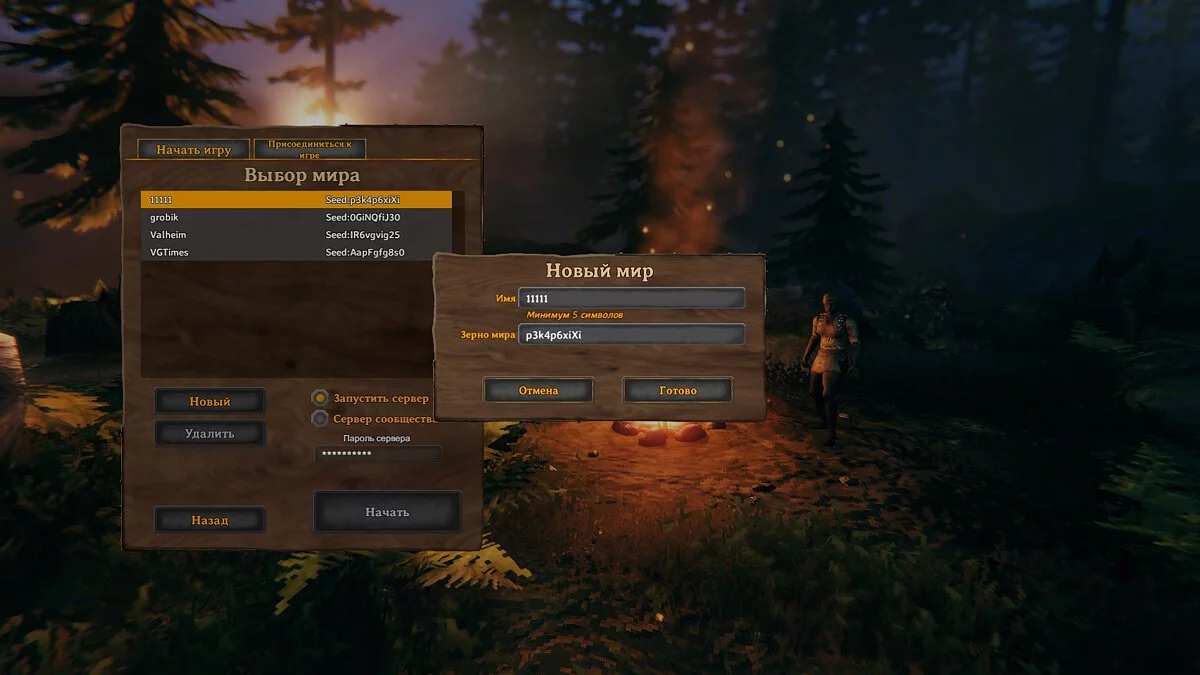 Стоит учесть, что в мире Valheim живёт только один такой торговец, поэтому на неизвестной местности игроку потребуется довольно много времени для его обнаружения. В качестве ещё одного способа можно воспользоваться отдельным миром. Для этого потребуется отключиться от игры и войти на новый сервер, но с другим семенем (Seed). Для этого после выбора игрового персонажа нажимаем кнопку «Новый». Вводим предпочитаемое имя и вписываем «p3k4p6xiXi» без кавычек в пункт «Зерно мира». В качестве примера ознакомьтесь со скриншотом ниже.