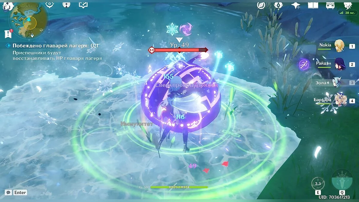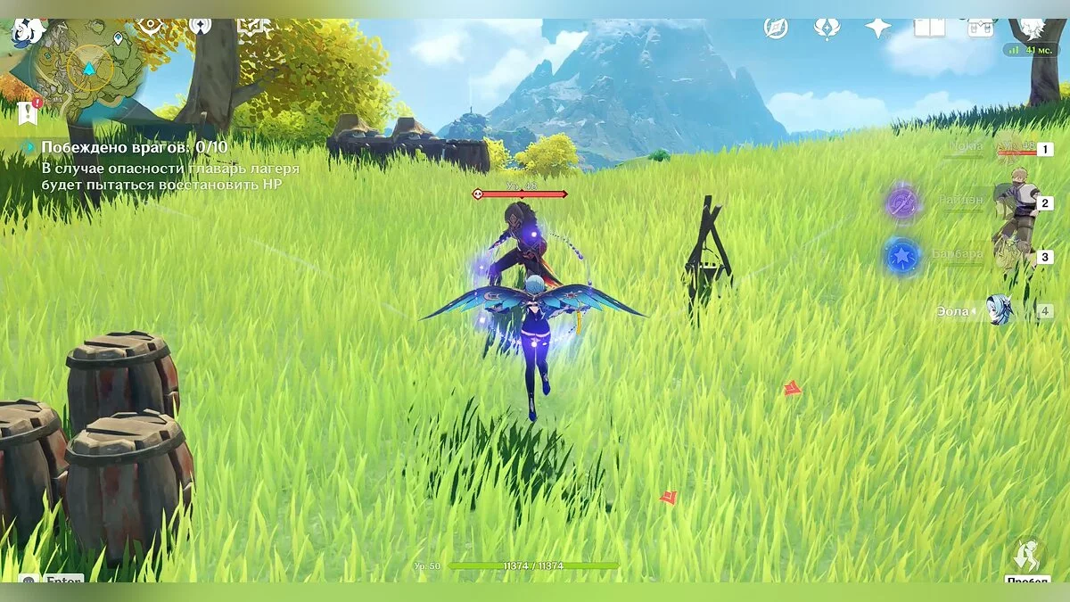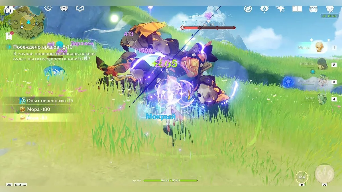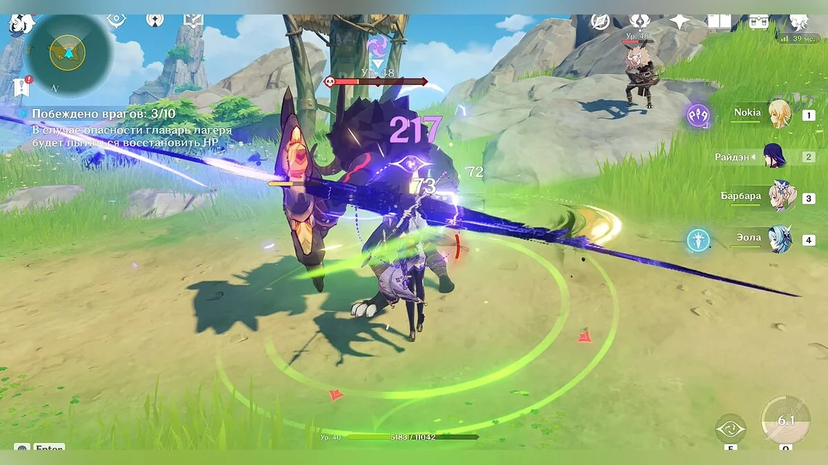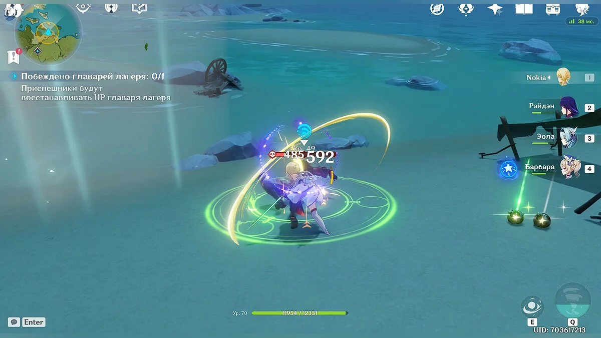 Так как сражение будет проходить на берегу океана, чтобы сэкономить время, старайтесь выманить врагов поближе к воде. Таким образом они приобретут эффект «мокрый» (эффект можно наносить любым героем стихии «гидро», но для этого понадобится потратить дополнительное время), после чего вы можете заморозить их на несколько секунд любым персонажем стихии «крио». Мы использовали Эолу, но здесь также подойдёт и не такой сильный персонаж как Кэйа.