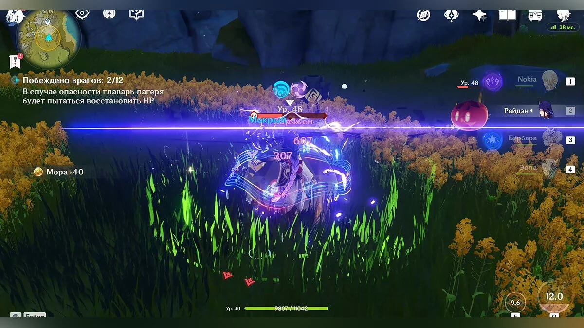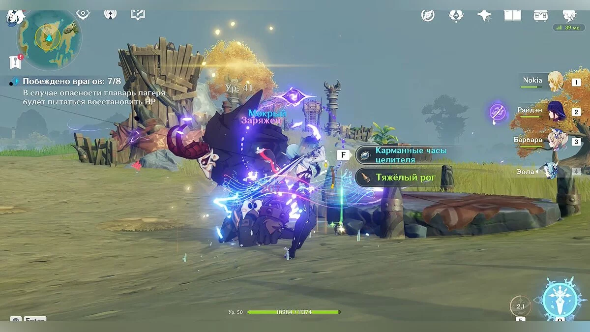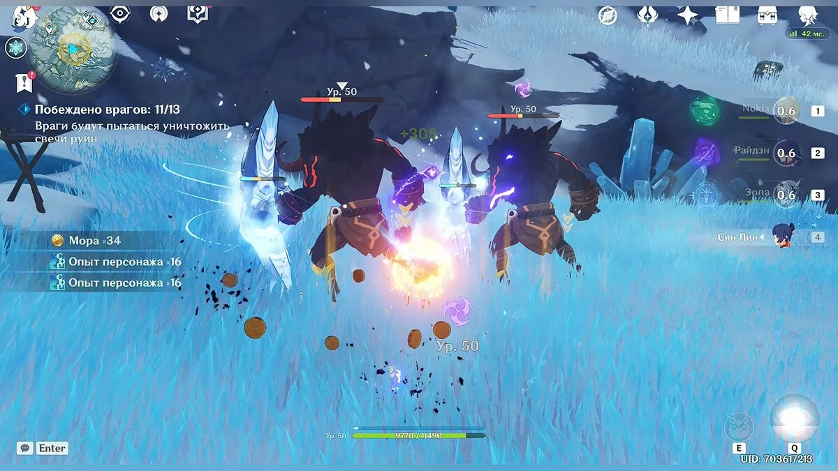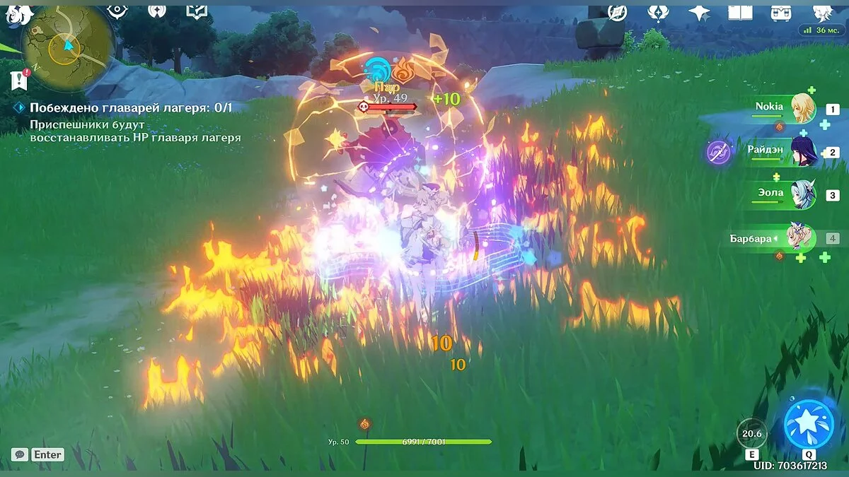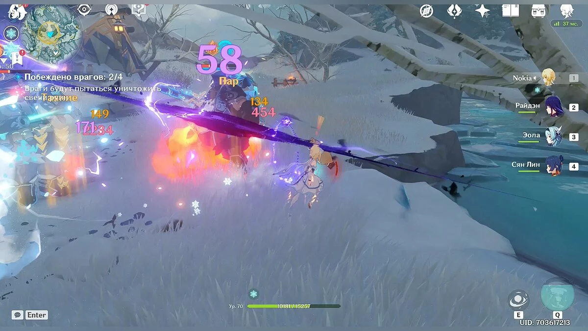 Так как сражение будет проходить на берегу океана, чтобы сэкономить время, старайтесь выманить врагов поближе к воде. Таким образом они приобретут эффект «мокрый» (эффект можно наносить любым героем стихии «гидро», но для этого понадобится потратить дополнительное время), после чего вы можете заморозить их на несколько секунд любым персонажем стихии «крио». Мы использовали Эолу, но здесь также подойдёт и не такой сильный персонаж как Кэйа.