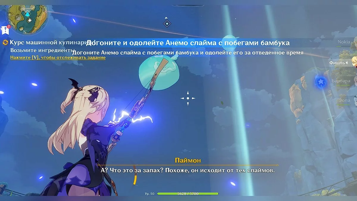 Следуйте за этими линиями, пока не доберётесь до трёх воздушных слаймов. Один из них украл ингредиенты и пытается сбежать. Игра даёт вам время, чтобы догнать слайма и забрать у него побеги бамбука. Мы поступили проще: выбрали в свой отряд дальнобойного персонажа и выстрелили по слайму перед тем, как он попытался сбежать.