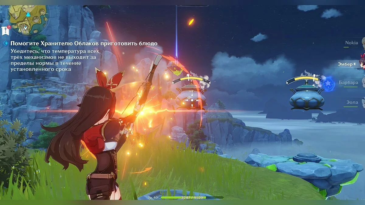 Вернитесь к Хранителю Облаков и приготовьте особое блюдо. Как обычно, во время приготовления блюда вам будут мешать монстры — крио и пиро хиличурлы. Следите за температурой котлов и завершите задание.