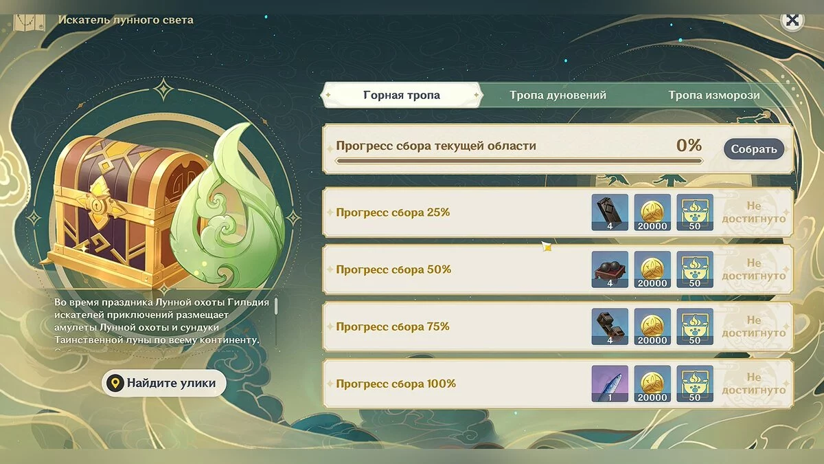 Во всех испытаниях этого этапа вам нужно отыскать амулеты Лунной охоты и сундуки Таинственной луны. Чтобы узнать примерное местонахождение сундуков и амулетов откройте страницу события и нажмите кнопку «Собрать». Откроется карта, на которой будет подсвечена определённая область. Тщательно исследуйте область, чтобы отыскать все предметы интереса и получить доступные награды.