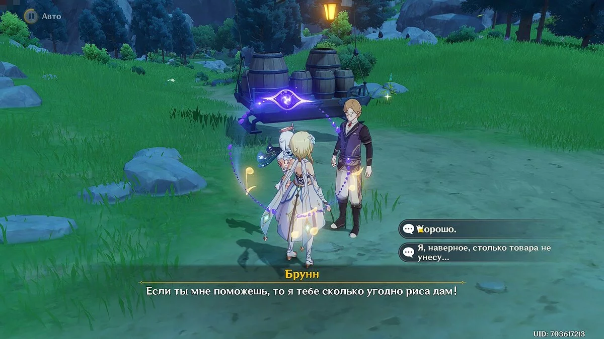 Следуйте за повозкой и уничтожайте нападающих на неё монстров. Когда доберётесь до украденных товаров, поговорите с Брунном и заберите рис. Вернитесь к Хранителю Облаков, чтобы воспользоваться устройством и приготовить блюдо.