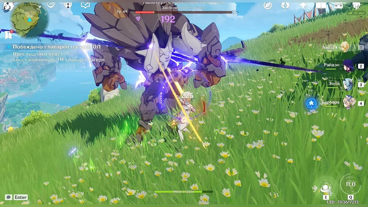 Лидер этого лагеря довольно сильный примо геовишап (Primo Geovishap). Он будет атаковать вас ударами в прыжке, поэтому старайтесь своевременно уклоняться от таких ударов. Ваша задача — нанести как можно больше урона врагу, чтобы он упал на землю. После этого продолжайте атаковать монстра.