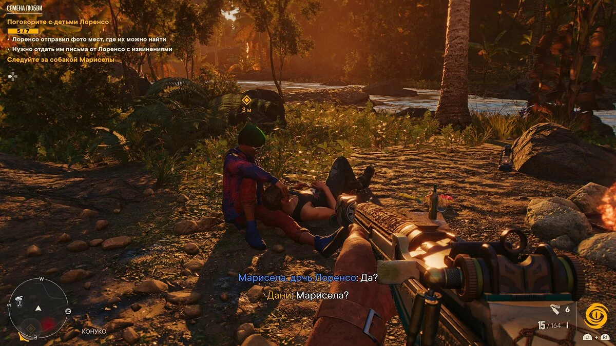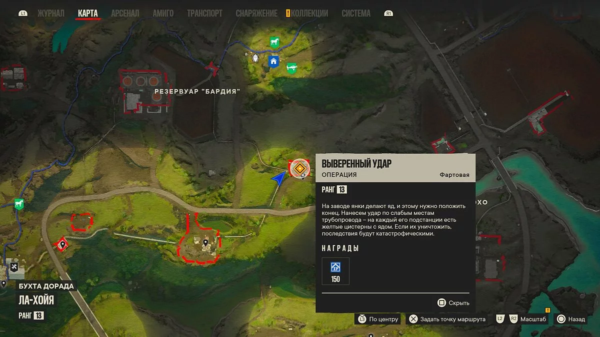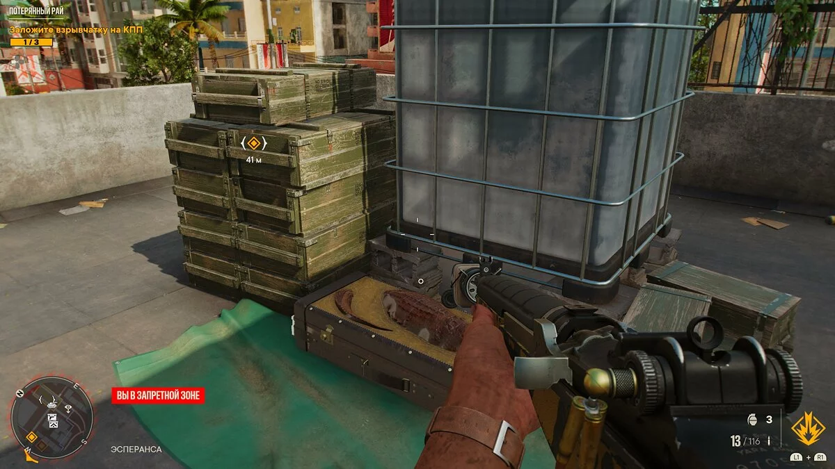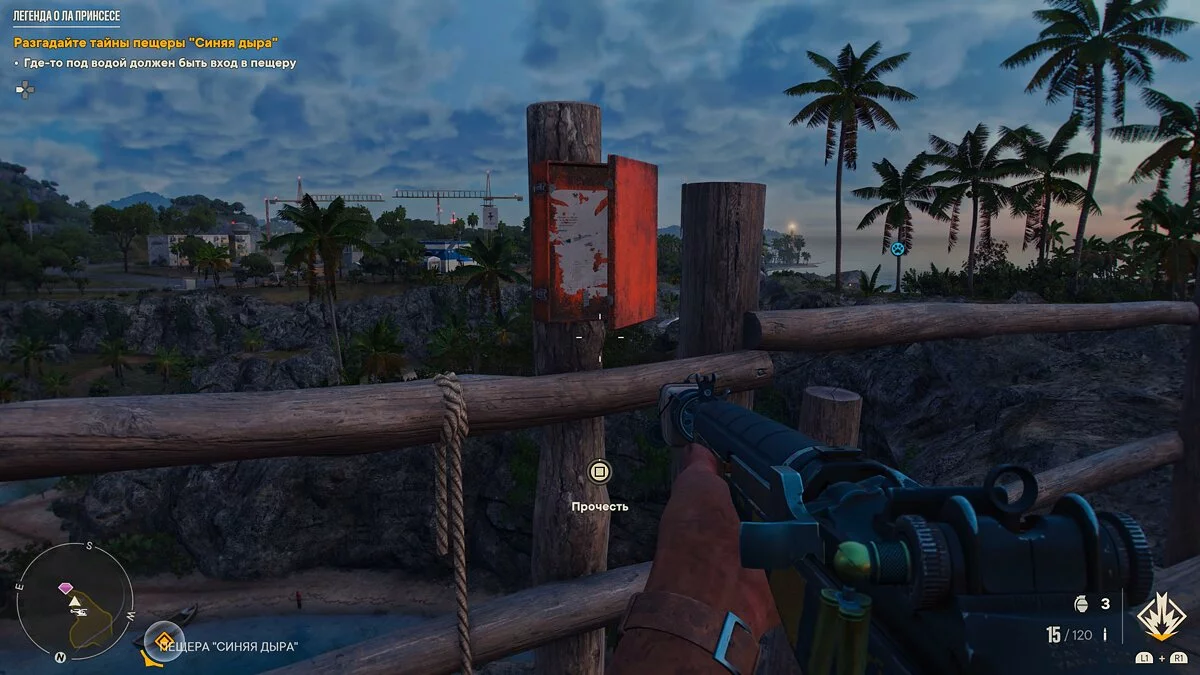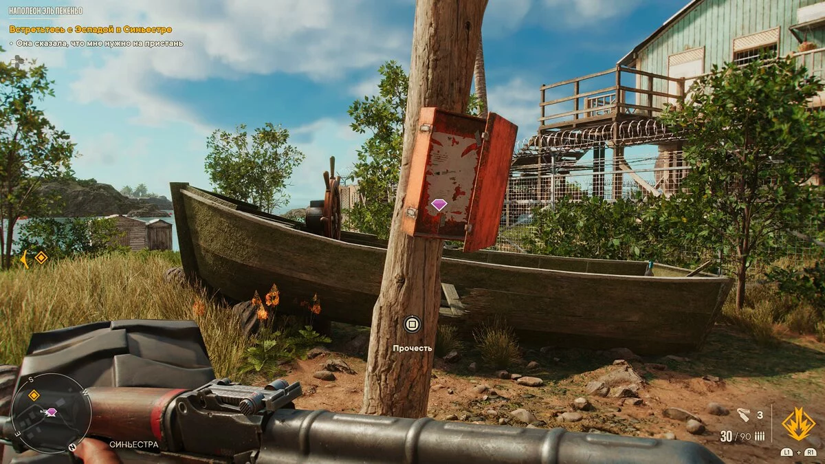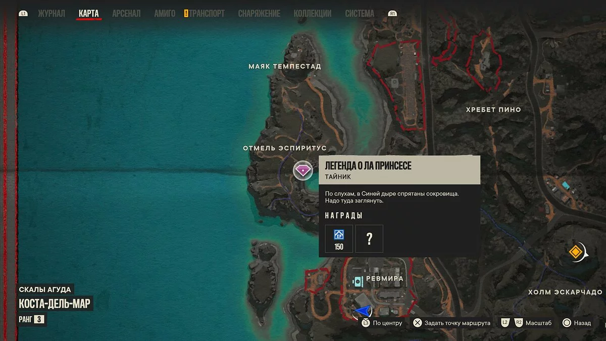 Прыгаем в лодку и плывём к маркеру для встречи с Филли. После разговора с мужчиной осматриваем два восклицательных знака, которые отмечаются на мини-карте. Откроется доступ к тайнику «Легенда о Ла Принсесе». Добираемся до указанного на карте маркера и зачищаем территорию от врагов.