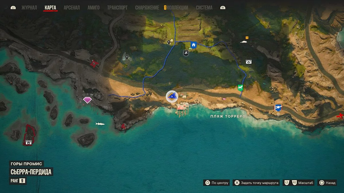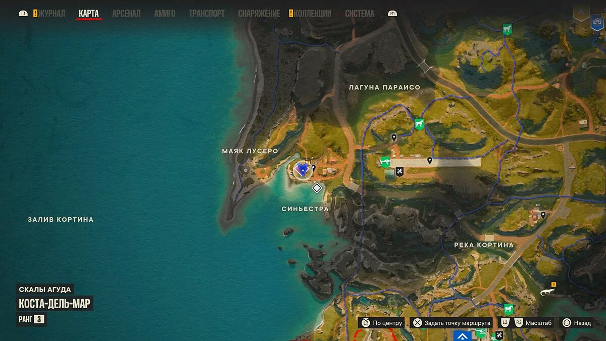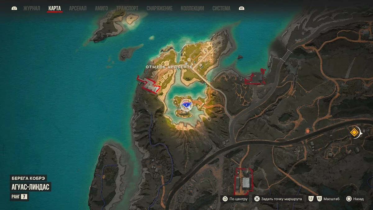 После получения отметки на карте в задании «Знакомство с Монтеро» отправляемся на восток острова (розовый значок алмаза). Осматриваем маркер, спрыгиваем в воду и заплываем в пещеру. Для обнаружения сокровища необходимо плыть под водой от одного участка пещеры до другого.